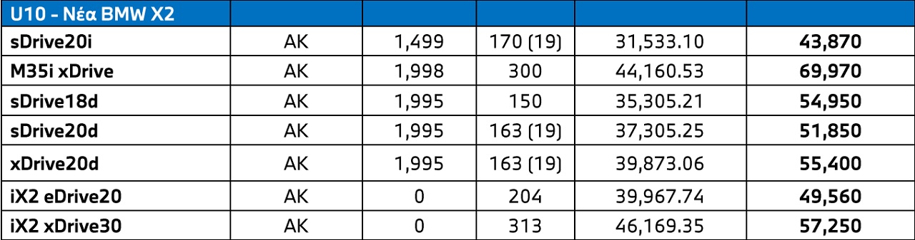 Ακολουθεί ο ενημερωμένος τιμοκατάλογος για όλες τις εκδόσεις της BMW X2, ενώ αξίζει να αναφέρουμε ότι στα αμιγώς ηλεκτρικά μοντέλα δεν περιλαμβάνεται το όφελος από το πρόγραμμα “Κινούμαι Ηλεκτρικά 3”.