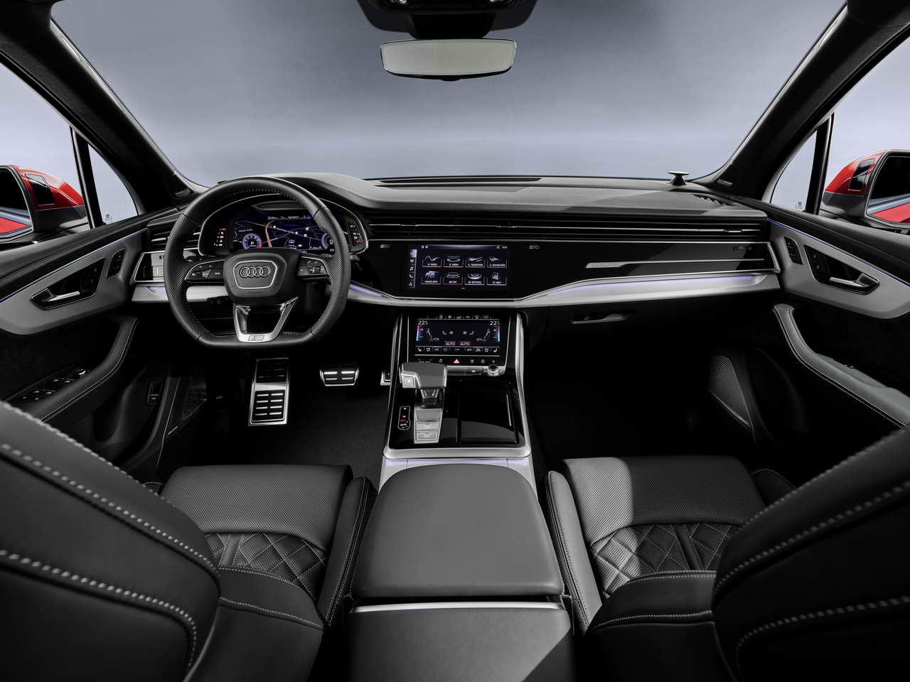 Στο ταμπλό του νέου Audi Q7 ξεχωρίζουν οι δύο μεγάλες οθόνες αφής. Το γνωστό σύστημα πλοήγησης της Audi, MMI Plus, προσφέρει μια σειρά υπηρεσιών όπως δημιουργία Wi-Fi hotspot, φυσικός φωνητικός έλεγχος, υβριδικό ραδιόφωνο και η νέα φωνητική υπηρεσία Alexa της Amazon.