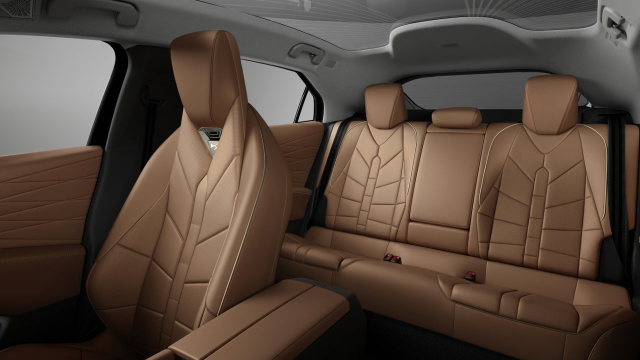 Το εσωτερικό εκφράζει τη νέα σχεδιαστική γλώσα της DS Automobiles και παρουσιάζεται πολύ προσεγμένο στις λεπτομέρειές του σε μια προσπάθεια να συνδυάσει πολυτελή στοιχεία με μοντέρνες λιτές γραμμές που κεντρίζουν το ενδιαφέρον. Τα ανάγλυφα ένθετα “Clous de Paris” στο τιμόνι και τους αεραγωγούς, καθώς και οι μαργαριταρένιες ραφές στο ταμπλό και τα υποβραχιόνια, σήμα κατατεθέν της DS Automobiles, εξακολουθούν να υπάρχουν. Μαζί με τη δερμάτινη ταπετσαρία Nappa σε μοτίβο Bracelet ρολογιού, όλα αυτά τα βασικά στοιχεία συμβάλλουν στην ανάδειξη του γαλλικού savoir-faire της πολυτέλειας που θέλει να προσφέρει η γαλλική εταιρεία με τον εκτενή ατμοσφαιρικό φωτισμό να βάζει το δικό του λιθαράκι.