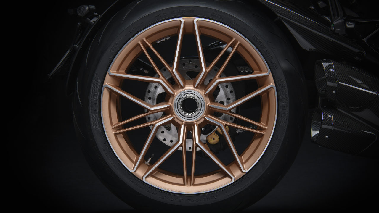 Παράλληλα το όνομα της Lamborghini κοσμεί τα πλαϊνά πλαστικά της μοτοσυκλέτας, ενώ όλο το “κοστούμι” είναι από ανθρακονήματα, όπως και τα καλύμματα της εξάτμισης. Επίσης το πλαίσιο, οι ζάντες αλλά και το μεταλλικό ένθετο στη σέλα είναι στην ίδια χρυσή απόχρωση που χρησιμοποιείται σαν δευτερεύον χρώμα στη Siàn FKP 37, ενώ στο μόνο σημείο που βλέπουμε το χαρακτηριστικό κόκκινο χρώμα της Ducati είναι στις ακτινικά τοποθετημένες 4πίστονες δαγκάνες της Brembo. Ο αριθμός “63” στις εισαγωγές αέρα τιμά το 1963, το έτος ίδρυσης της Lamborghini.