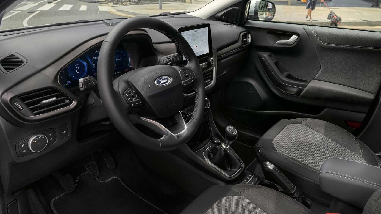 Το Ford Puma Titanium X διαθέτει επίσης δερμάτινο τιμόνι και ξύλινες επενδύσεις γύρω από το ταμπλό και τον πίνακα οργάνων, καθώς και κομψά υφασμάτινα ένθετα στα εσωτερικά πάνελ των θυρών.