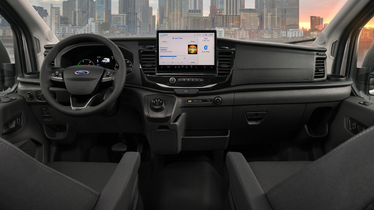 Το E-Transit εισάγει το σύστημα επικοινωνίας και πληροφοριών SYNC 4 στη γκάμα επαγγελματικών οχημάτων της Ford στην Ευρώπη, που προσφέρει διπλάσια υπολογιστική ισχύ από το SYNC 3 και ελέγχεται μέσω μιας οθόνης αφής 12 ιντσών.