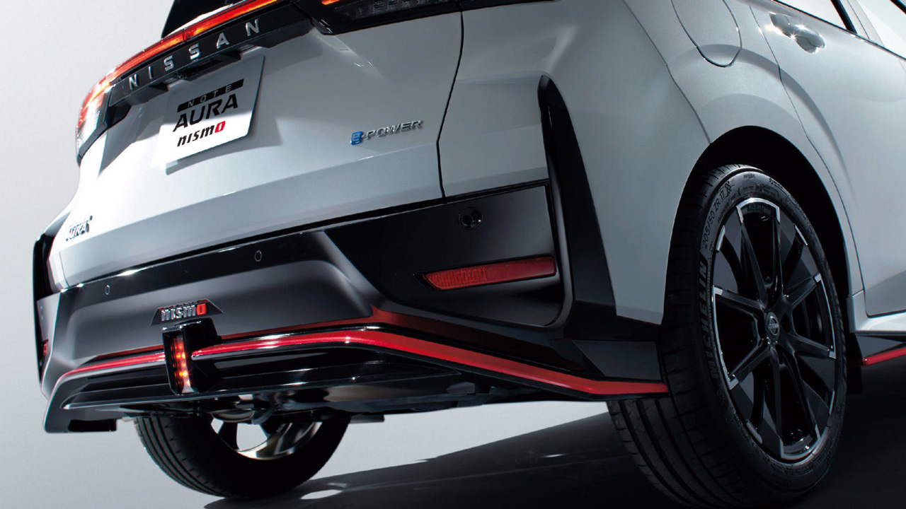 Εξωτερικά, το νέο Nissan Note Aura Nismo φέρει αρκετά “sportive” στοιχεία, όπως για παράδειγμα τις κόκκινες λεπτομέρειες στο κάτω μέρος του αμαξώματος. Επιπλέον, στο πίσω τμήμα συναντάμε μία αεροτομή, ενώ οι ζάντες αλουμινίου είναι μεγέθους 17 ιντσών. Συνολικά διατίθενται πέντε αποχρώσεις αμαξώματος, συμπεριλαμβανομένων τεσσάρων δίχρωμων συνδυασμών και το έμβλημα της Nismo είναι ανασχεδιασμένο συνδυάζοντας ματ αποχρώσεις χρωμίου και κόκκινου.