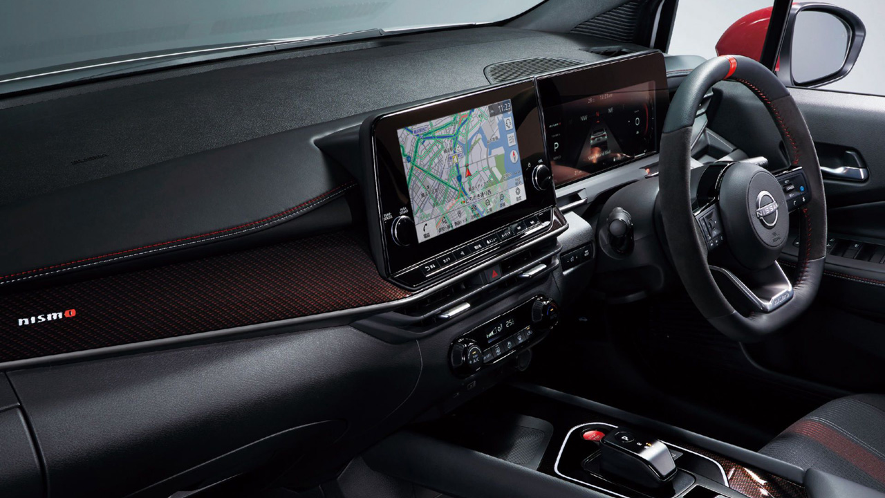 Στο εσωτερικό επικρατούν και πάλι οι κόκκινες πινελιές, όπως για παράδειγμα το χαρακτηριστικό σιρίτι στην στεφάνη του τιμονιού. Ασφαλώς δεν απουσιάζει το λογότυπο Nismo, ενώ εντυπωσιακά είναι και τα δίχρωμα καθίσματα τύπου μπάκετ της Recaro με κεντημένο το λογότυπο Nismo.