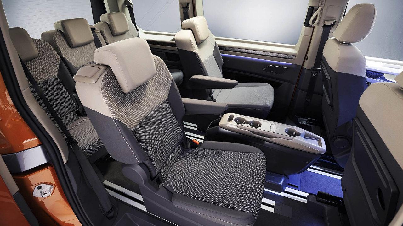 Το επίπεδο δάπεδο διαθέτει έξι συνολικά ράγες για τα καθίσματα και το πολυχρηστικό τραπεζάκι. Το τραπεζάκι μπορεί να μετακινηθεί μέσα στον χώρο των επιβατών, να πάρει διάφορες μορφές και να γίνει ακόμα και κεντρική κονσόλα ανάμεσα στα καθίσματα του οδηγού και του συνοδηγού (βασικός εξοπλισμός στο Multivan Life και Style). Στο πίσω μέρος, τα καθίσματα είναι εξοπλισμένα με θύρες USB-C⁠.