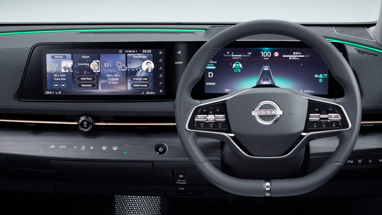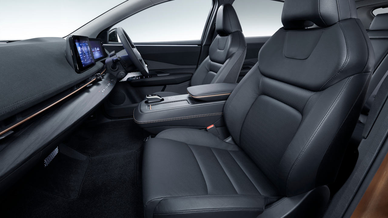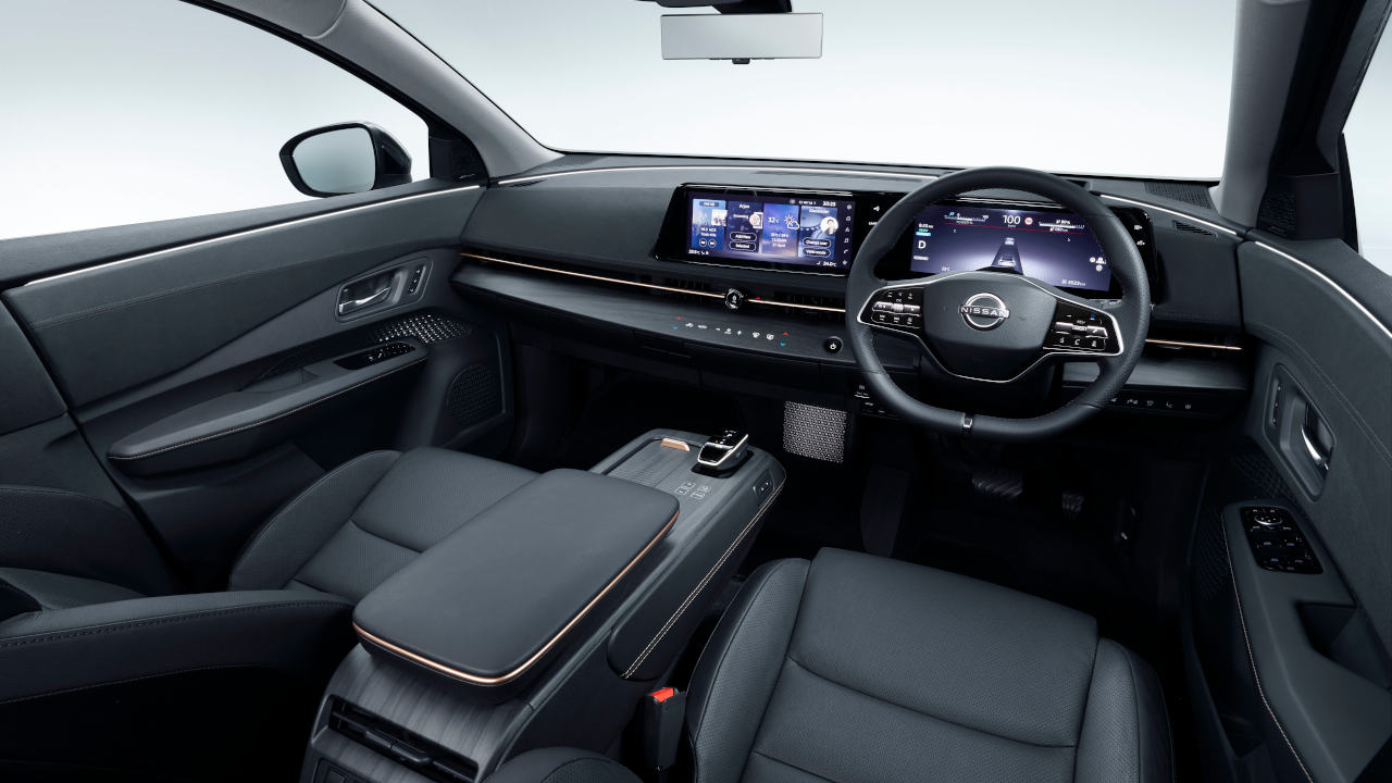 Η μοντέρνα σχεδίαση που κινείται προς το μίνιμαλ κάνει την εμφάνιση της στην καμπίνα του Ariya η οποία σχεδιάστηκε με στόχο να προσφέρει άνεση και ηρεμία στους επιβαίνοντες. Η Nissan κάνει λόγο για μία από τις πιο ευρύχωρες καμπίνες της κατηγορίας, κάτι που φαίνεται ειδικά στο εμπρός μέρος. Η απουσία του κινητήρα εσωτερικής καύσης επέτρεψε, για παράδειγμα την τοποθέτηση της μονάδας του κλιματισμού στο χώρο που κανονικά θα βρισκόταν το μοτέρ και τα περιφερειακά του. Αυτό είχε σαν αποτέλεσμα την απελευθέρωση σημαντικών χώρο χαμηλά και ανάμεσα στα πόδια του οδηγού και του συνοδηγού. Στο ταμπλό βλέπουμε λίγα κουμπιά αφής, τα οποία δονούνται κατά τη χρήση τους, ενώ η κεντρική κονσόλα είναι πτυσσόμενη και δημιουργεί χώρο πάνω στο οποίο θα μπορούσατε να εργαστείτε.