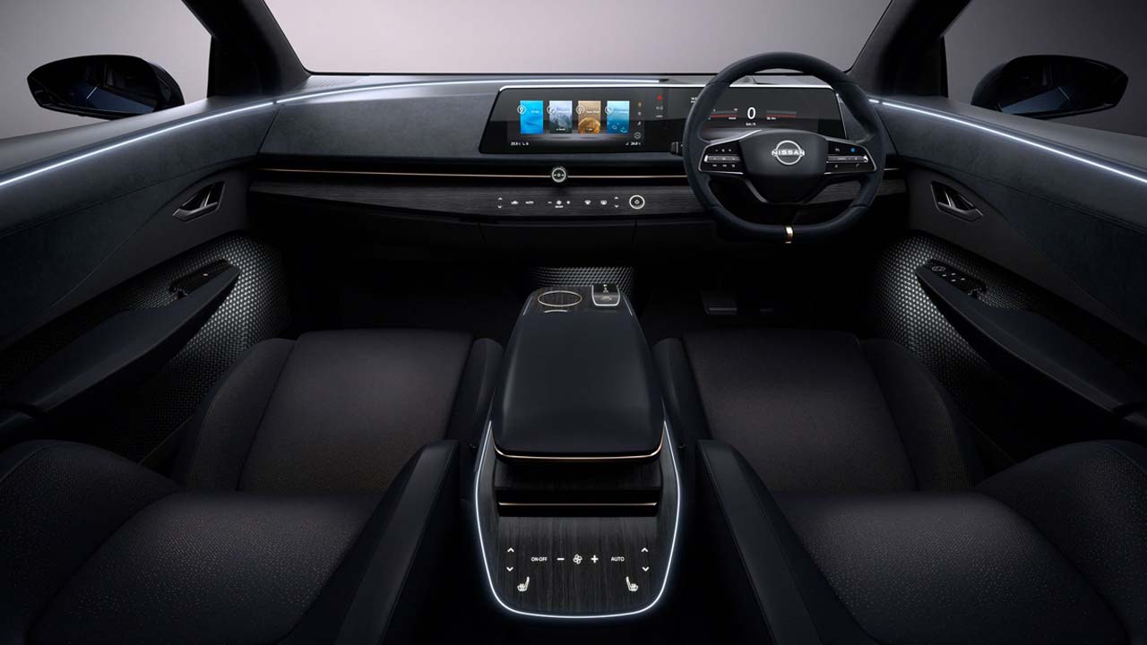 Φυσικά δεν μπορούμε να μην αναφερθούμε και στο εσωτερικό του Nissan Ariya, το οποίο ακολουθεί μινιμαλιστική φιλοσοφία. Φυσικά κουμπιά δεν υπάρχουν, καθώς έχουν αντικατασταθεί από πάνελ αφής, ενώ πίνακας οργάνων και οθόνη πολυμέσων είναι ένα.