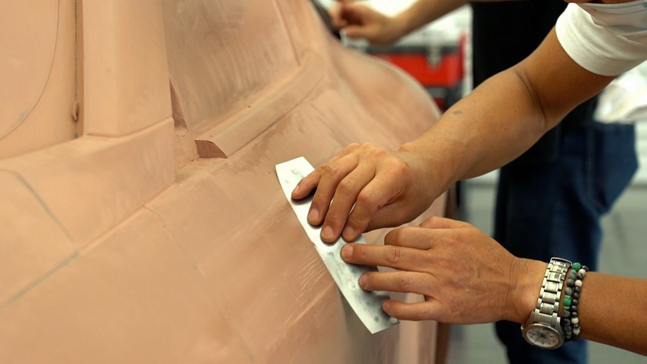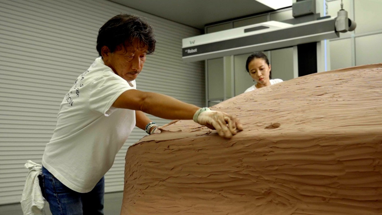 “Για να δημιουργήσουμε ένα μοντέλο πλήρους κλίμακας, ξεκινάμε πρώτα με ένα μοντέλο από πηλό κλίμακας 1/4, στη συνέχεια το σαρώνουμε και το μετατρέπουμε σε ένα μοντέλο που είναι τέσσερις φορές μεγαλύτερο, χρησιμοποιώντας ψηφιακά δεδομένα. Έπειτα, ξεκινάμε τη διαδικασία διαμόρφωσης του μοντέλου πλήρους κλίμακας με μια μεγάλη πλάκα από πηλό”, μας λέει ο Yuki και συνεχίζει “Έχουμε ένα φούρνο όπου ζεσταίνουμε τον πηλό. Κατευθείαν από το φούρνο αρχίζουμε να προσθέτουμε υλικό και να το πλάθουμε με το χέρι. Όταν ο πηλός κρυώσει λίγο μπορούμε να χρησιμοποιήσουμε εργαλεία για να ξύσουμε και να προσθέσουμε φόρμα, καθώς αρχίζει να σκληραίνει σε θερμοκρασία δωματίου.”