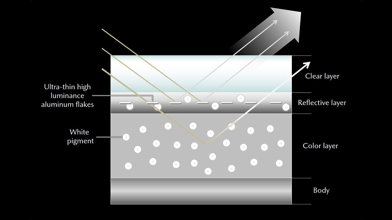 Επιπλέον, η ιαπωνική εταιρεία μπόρεσε να επιτύχει ένα φινίρισμα «βαμμένο στο χέρι», με τις νιφάδες αλουμινίου να ευθυγραμμίζονται ομαλά σε τακτά χρονικά διαστήματα στο ανακλαστικό στρώμα. Ολόκληρη η επιφάνεια λάμπει όταν εκτίθεται στο φως και εμφανίζει μια ρεαλιστική μεταλλική υφή. Οι μεμονωμένες νιφάδες αλουμινίου κατανέμονται ομοιόμορφα και παράλληλα με τους κυματισμούς της επιφάνειας του αμαξώματος, παράγοντας μια γυαλιστερή και σκιασμένη εμφάνιση όταν την αγγίζει το φως παρά τη φωτεινότητα του Rhodium White Premium.