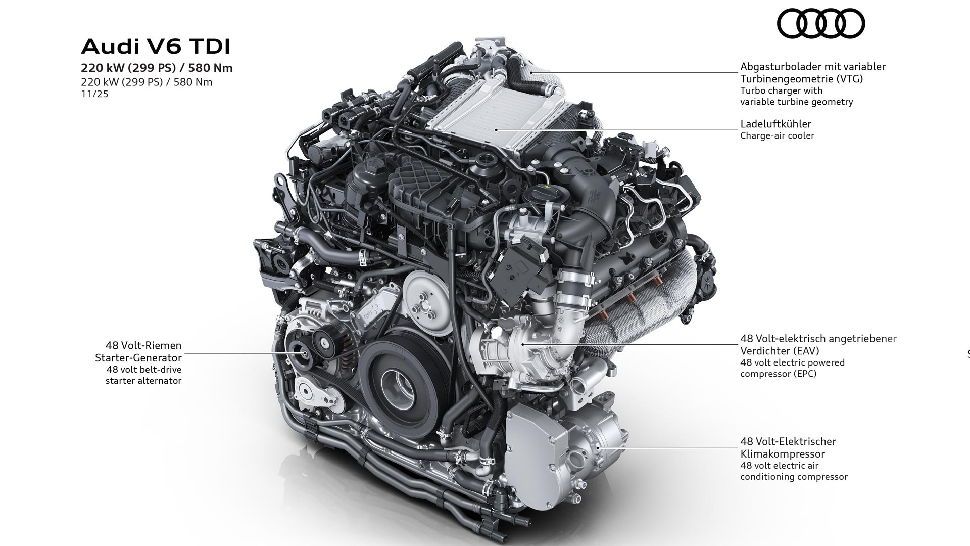 Σε αυτόν τον νέο κινητήρα που θα δούμε στα Q5 και A6, συνδυάζεται για πρώτη φορά disel με την υβριδική τεχνολογία MHEV plus. Η χωρητικότητα του V6 αγγίζει τα 3 λίτρα, με την ισχύ να φτάνει στους 299 ίππους και τη μέγιστη ροπή στα 580 Nm. Το ηλεκτρικό σύστημα προσφέρει 24 ίππους και 230 Nm ροπής, ενώ με την ανάκτηση ενέργειας φορτίζεται μία μπαταρία λιθίου-σιδήρου-φωσφορικού άλατος (LFP). Το αποτέλεσμα είναι μια σημαντική μείωση κατανάλωσης και εκπομπών CO₂, καθώς και αισθητά πιο δυναμική απόκριση στο πάτημα του γκαζιού.