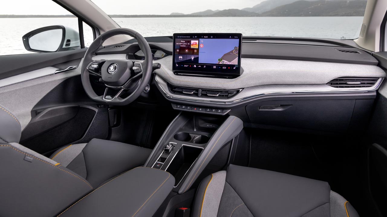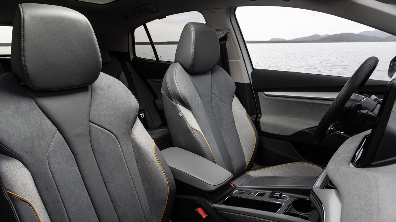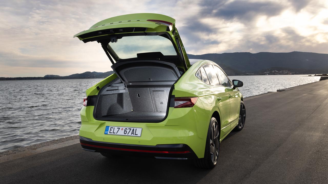 Λόγω της σχεδίασής του και του μεγάλου μεταξονίου, η πλατφόρμα MEB ανοίγει νέες δυνατότητες όσον αφορά τις αναλογίες και το σχεδιασμό του αμαξώματος. Δεδομένου ότι η μπαταρία είναι πλήρως ενσωματωμένη στο κάτω μέρος και τα ηλεκτρικά οχήματα δεν διαθέτουν σήραγγα μετάδοσης, ο διαθέσιμος χώρος για τους επιβάτες των πίσω καθισμάτων είναι επίσης ιδιαίτερα γενναιόδωρος. Το πορτμπαγκάζ του Enyaq Coupé iV μετράει 570 απόλυτα χρηστικά λίτρα στο διαμέρισμα των αποσκευών, μόλις 15 λίτρα μικρότερο από το «συμβατικό» Enyaq, άρα οι Τσέχοι έκαναν έξυπνη σχεδιαστική επιλογή με την coupe γραμμή. Να σημειώσουμε εδώ ότι στο εσωτερικό χρησιμοποιήθηκαν φυσικά, βιώσιμα επεξεργασμένα και ανακυκλωμένα υλικά.