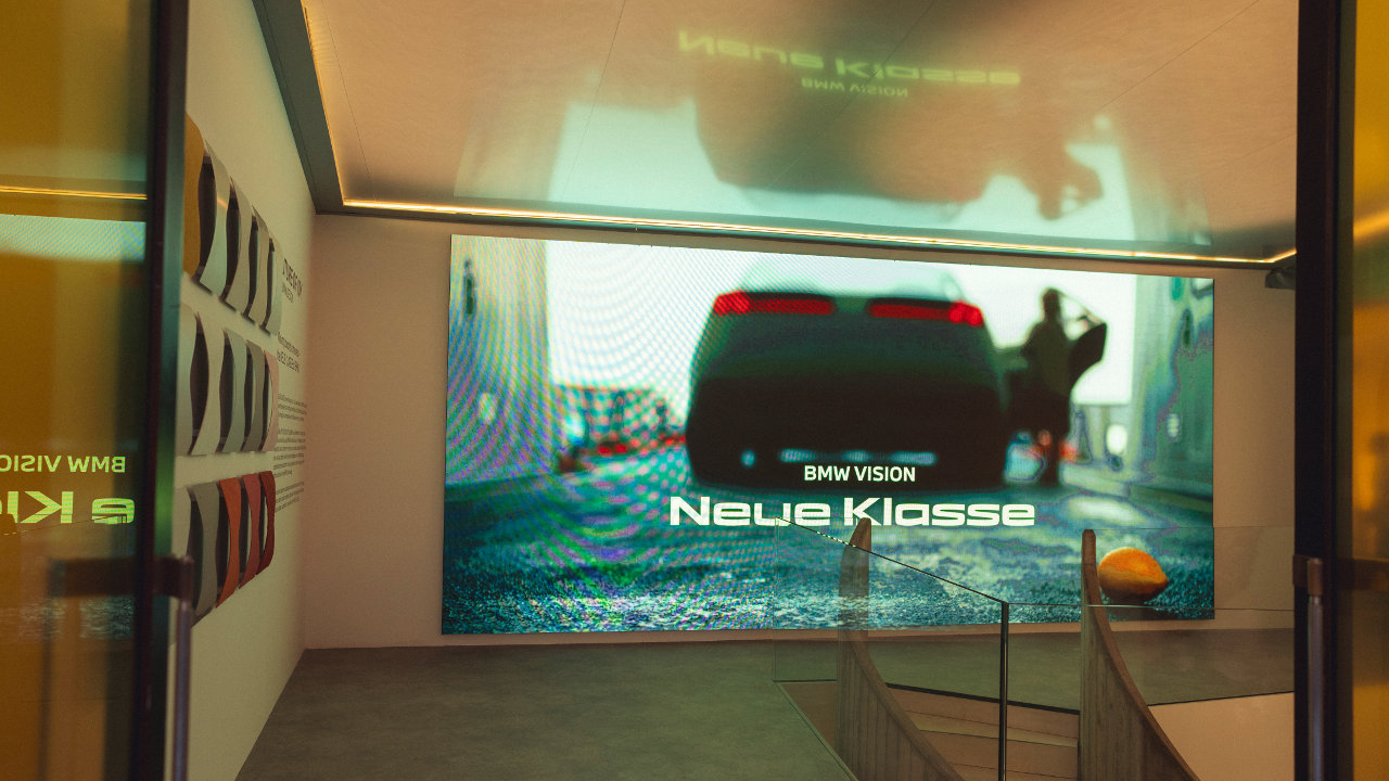Ένα φωτιστικό σόου παίζει με τις χρωματικές φιλοσοφίες των δύο οχημάτων: κίτρινο για την BMW Vision Neue Klasse και πορτοκαλί για την BMW Vision Neue Klasse X. Η ματ ασημί οροφή της αίθουσας δημιουργεί μια αίσθηση ατελείωτου χώρου ως αποτέλεσμα της αντανάκλασης συμβολίζοντας την αρμονία μεταξύ ανθρώπων και τεχνολογίας. Βιώσιμα δείγματα χρωμάτων και υλικών, έργα τέχνης από τη διαδικασία εργασιών και σχεδίασης και παρουσιάσεις πολυμέσων των BMW Vision Neue Klasse και Vision Neue Klasse X επιτρέπουν στο κοινό να βυθιστεί στην αίσθηση της ‘θετικής ελαφρότητας’ της Neue Klasse.