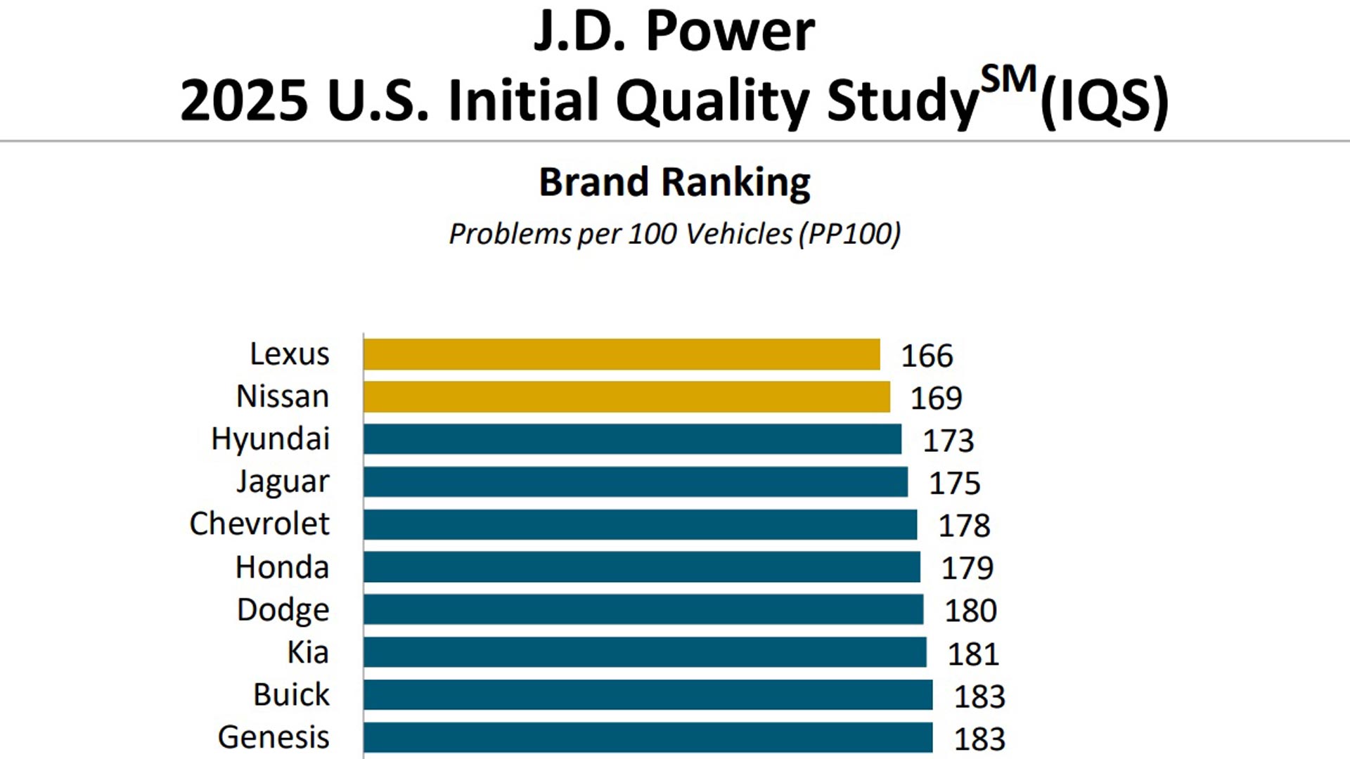 Στην πρώτη θέση, λοιπόν, συναντάμε την Lexus, η οποία κατέγραψε τα λιγότερα προβλήματα. Συγκεκριμένα, υπήρξαν 166 αναφορές ανά 100 οχήματα. Στη δεύτερη θέση βρίσκεται η Nissan, η οποία πέτυχε βαθμολογία 169. Στην τρίτη θέση συναντάμε την Hyundai, η οποία είχε 173 αναφορές ανά 100 αυτοκίνητα. Όπως είδατε, η πρώτη τριάδα αποτελείται από δύο ιαπωνικές εταιρείες και μία κορεάτικη. Το ίδιο σκηνικό ακολουθείται και στο Top 10, με τις τρεις εταιρείες να είναι Ιαπωνικές (Lexus, Nissan, Honda) και τις τρεις να είναι κορεάτικες (Hyundai, Kia, Genesis).