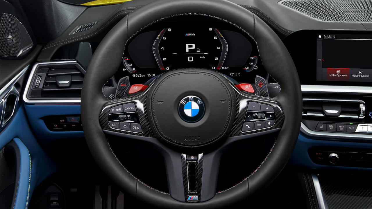 Στάνταρ είναι και ο αυτόματος τριζωνικός κλιματισμός, ο εσωτερικός φωτισμός LED, ο κρυφός φωτισμός και ένα hi-fi σύστημα ηχείων. Το BMW Live Cockpit Professional (με όλες τις ψηφιακές ενδείξεις συγκεντρωμένες, σύστημα πλοήγησης βασισμένο σε cloud, BMW Maps και BMW Intelligent Personal Assistant) είναι επίσης στάνταρ για τις νέες BMW M3 Sedan και BMW M4 Coupé. Χωρίς επιπλέον κόστος, ο ενδιαφερόμενος μπορεί να “θυσιάσει” τη στάνταρ πλαστική και ενισχυμένη με ανθροκονήματα οροφή για χάρη της ατσάλινης που φέρει ωστόσο ηλιοροφή. Διαθέσιμο είναι τέλος και το πακέτο M Race Track που μειώνει το βάρος και περιλαμβάνει κεραμικά φρένα M Carbon, πολύ ελαφρές ζάντες αλουμινίου M (διατίθενται προαιρετικά με ελαστικά semi-slick) και bucket καθίσματα M Carbon.