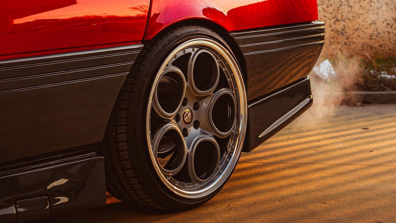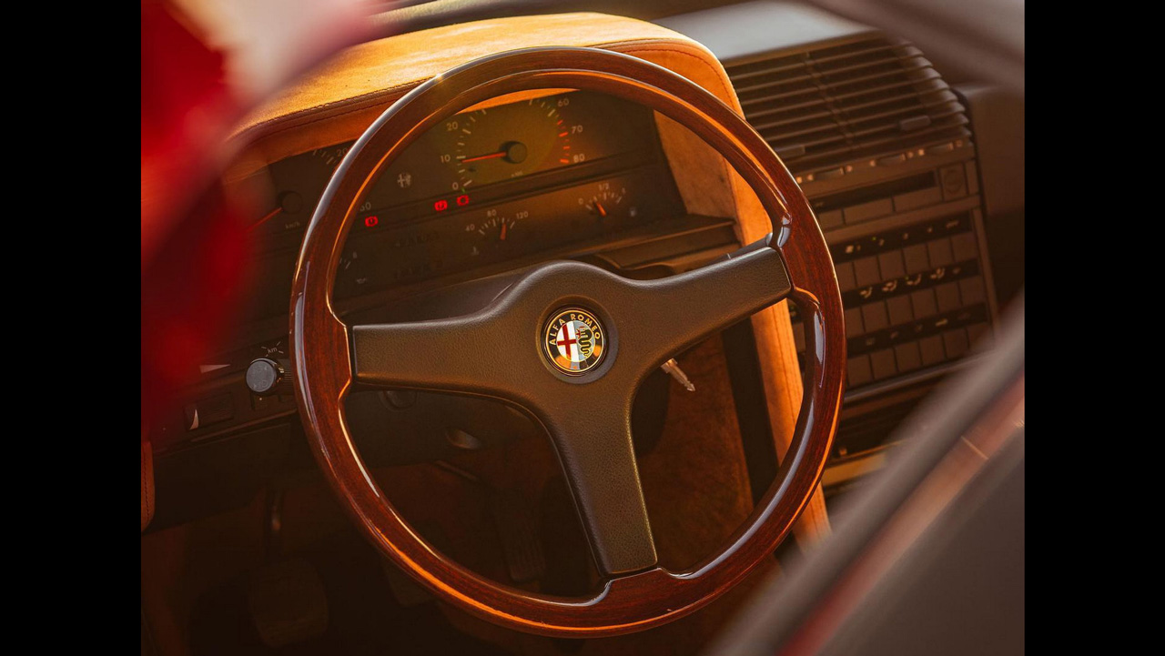 Αλλαγές υπάρχουν και στο εσωτερικό αυτής της restomod Alfa Romeo 164, όπως για παράδειγμα οι δερμάτινες επενδύσεις. Σε αρκετά σημεία συναντάμε επιφάνειες alcantara, ενώ το ξύλινο περίβλημα του τιμονιού μας ταξιδεύει αρκετά χρόνια πίσω.