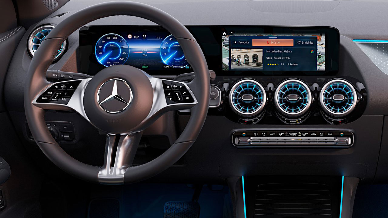 Συνεχίζουμε με το εσωτερικό, εκεί όπου η σημαντικότερη αλλαγή αφορά στο νέας σχεδίασης τιμόνι, το οποίο φέρει και πάλι κουμπιά αφής. Στο κέντρο υπάρχει μία οθόνη αφής μεγέθους 10,25 ιντσών, η οποία ανήκει πλέον στον βασικό εξοπλισμό. Εννοείται ότι στο σύστημα πολυμέσων “τρέχει” η τελευταία γενιά του MBUX συστήματος, ενώ αναβαθμισμένη είναι και η κάμερα οπισθοπορείας των δύο μοντέλων.