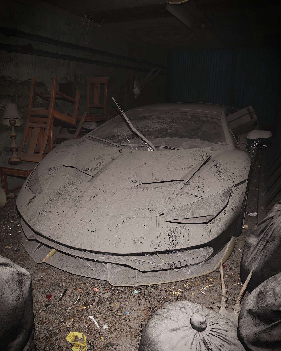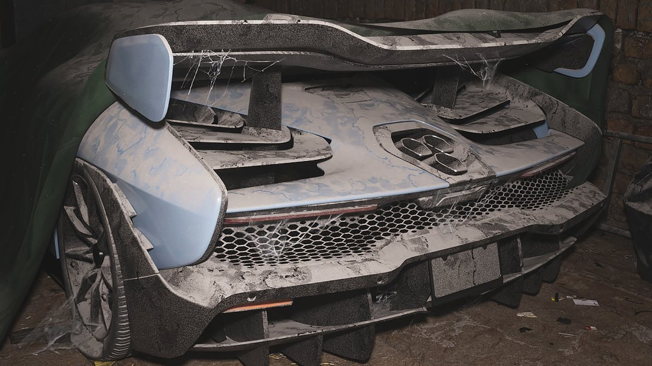 Ο Ιταλός “3d artist” έχει δημιουργήσει αρκετά πανάκριβα supercars που φαίνονται εγκαταλελειμμένα, μέσα στις σκόνες και τους ιστούς αραχνών. Για παράδειγμα, θα δούμε μία Lamborghini Centenario σε μία σκοτεινή αποθήκη. Δίπλα της, απεικονίζονται άκρως ρεαλιστικά κάποια παλιά έπιπλα και σκουπίδια. Άλλη μία δημιουργία του, ίσως η πιο εντυπωσιακή, είναι η Bugatti Chiron.