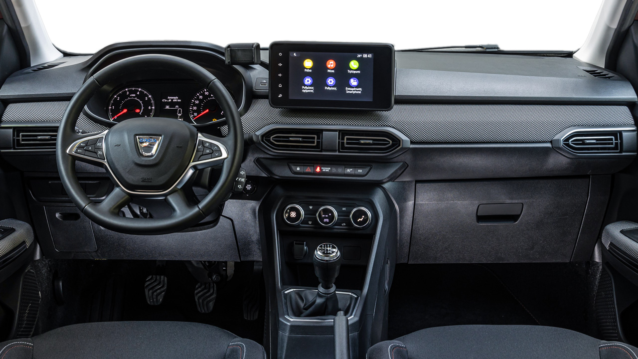 Περνάμε στο εσωτερικό, εκεί όπου υπάρχει και το μεγαλύτερο ενδιαφέρον, μιας και το Dacia Jogger προσφέρεται με τρίτη σειρά καθισμάτων. Το μεταξόνιο έχει εκτοξευθεί στα 2.897 χλστ., ώστε να υπάρχει επαρκής χώρος και για τους επιβάτες της τελευταίας σειράς, ενώ το σχήμα της οροφής εξασφαλίζει άπλετο χώρο και για το κεφάλι. Όσο για τον όγκο αποσκευών, κυμαίνεται από τα 160 έως τα 1.819 λτ., ενώ με την τελευταία σειρά αναδιπλωμένη ο χώρος αποσκευών αγγίζει τα 708 λτ. Από εκεί και πέρα, στην κεντρική κονσόλα υπάρχει μία ψηφιακή οθόνη αφής μεγέθους 8 ιντσών, η οποία περιλαμβάνει Android Auto και Apple CarPlay. Στην πρώτη επαφή μας “έπεισε” για τους χαοτικούς χώρους, ενώ τα υλικά κατασκευής παραπέμπουν σε… Dacia, δηλαδή είναι μεν με σκληρά στην υφή, αλλά δείχνουν ανθεκτικά και η συναρμολόγηση φαίνεται εξαιρετική.