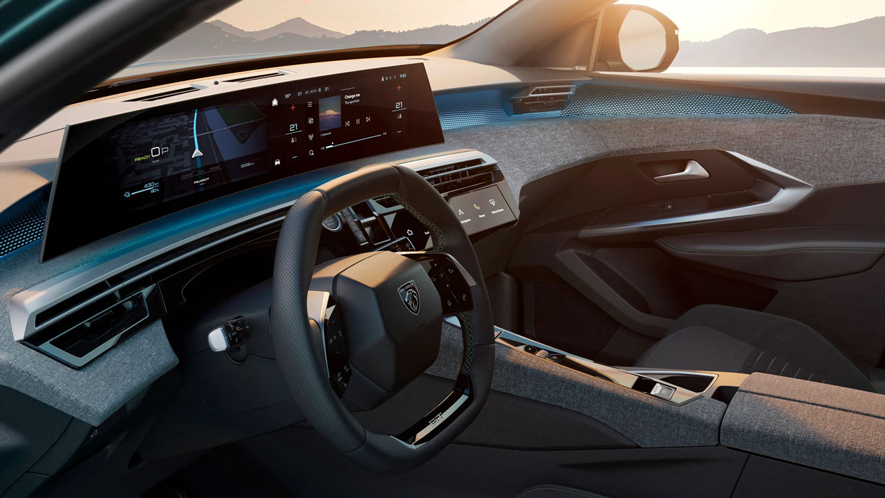 Πέρα από την εξωτερική εμφάνιση, βλέπουμε και εικόνες από την καμπίνα. Εκεί, μπορούμε να εντοπίσουμε το εντελώς νέο i-COCKPIT. Ουσιαστικά, πρόκειται για ένα ενιαίο πάνελ, με μία οθόνη σε ρόλο πίνακα οργάνων και μία οθόνη αφής να δημιουργούν μία μεγάλη, κυρτή επιφάνεια.