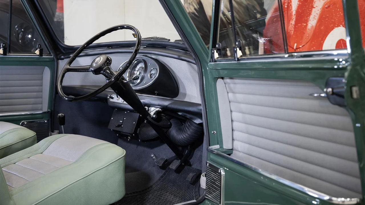 Αρχικά, να αναφέρουμε ότι πρόκειται για ένα MINI Cooper S πρώτης γενιάς που βγήκε από το εργοστάσιο το 1965. Από τότε μέχρι σήμερα, έχει διανύσει μόλις 250 μίλια (κάτι παραπάνω από 400 χιλιόμετρα) και πριν από περίπου πέντε χρόνια δέχθηκε την περιποίηση της JD Classics. Εννοείται πως βρίσκεται σε πλήρως εργοστασιακή κατάσταση και διατηρεί το ίδιο “Almond Green” χρώμα από την πρώτη του ημέρα.