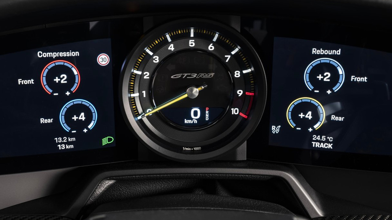 Η 911 GT3 RS, διαθέτει τρία διαφορετικά προγράμματα οδήγησης: Normal, Sport και Track. Στο τελευταίο, οι βασικές ρυθμίσεις μπορούν να γίνουν κατά βούληση. Ανάμεσα στις διαφορετικές ρυθμίσεις, η συμπίεση/αποσυμπίεση της ανάρτησης τόσο εμπρός όσο και πίσω, μπορούν να ρυθμιστούν ξεχωριστά και σε διαφορετικά στάδια. Το πίσω διαφορικό, μπορεί επίσης να ρυθμιστεί ως προς τον βαθμό εμπλοκής του από περιστροφικό διακόπτη στο τιμόνι. Η ρύθμιση γίνεται άμεσα καθώς διακόπτες και ενδείξεις προέρχονται κατευθείαν από τους αγώνες: τέσσερις περιστροφικοί διακόπτες καθώς και το button για το Drag Reduction System (DRS) είναι τοποθετημένοι πάνω στο τιμόνι, ξεχωρίζουν δε με καθαρά γραφικά σε κάθε ρύθμιση.
