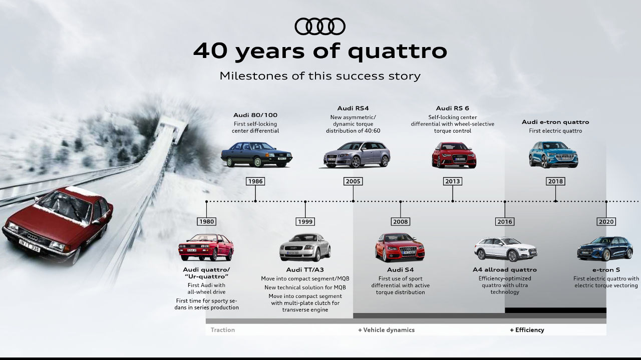 Με την quattro η Audi έφερε την 4κίνηση στην ευρεία παραγωγή μοντέλων που προορίζονται για χρήση στο δρόμο και έγραψε τις δικές της χρυσές σελίδες στην ιστορία του μηχανοκίνητου αθλητισμού, ειδικά με τις νίκες της στο WRC.