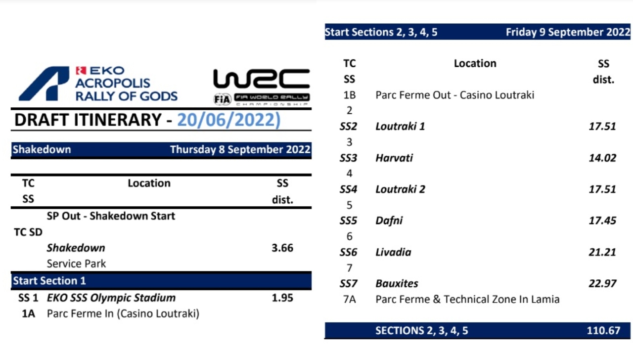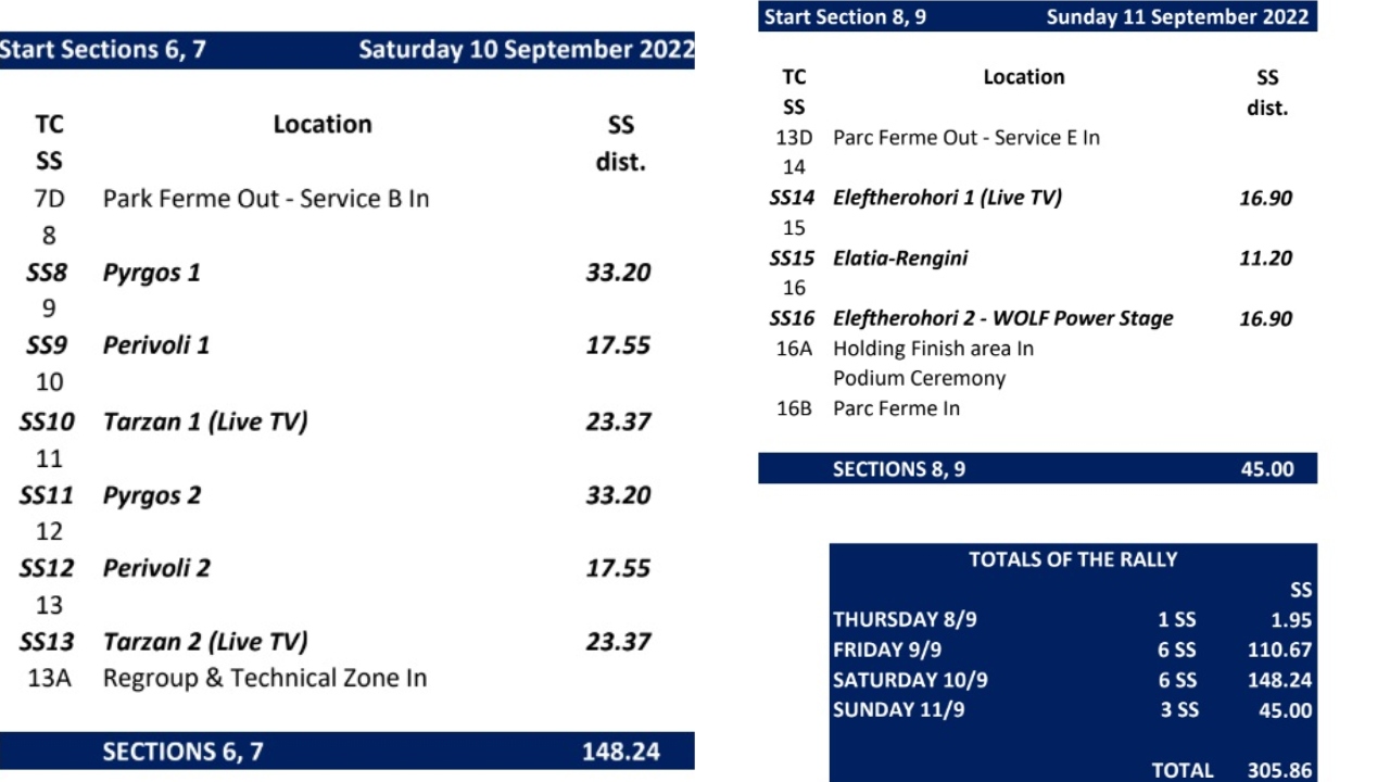 Ακολουθεί το αναλυτικό πρόγραμμα με τις ειδικές διαδρομές του τετραημέρου, αλλά και την χιλιομετρική απόσταση της κάθε μίας. Στην πρώτη εικόνα θα δείτε το πρόγραμμα Πέμπτης και Παρασκευής, ενώ στη δεύτερη τις ειδικές Σαββάτου και Κυριακής. Η συνολική απόσταση που θα διανύσουν τα πληρώματα που θα φτάσουν στον τερματισμό είναι 305,86 χλμ.