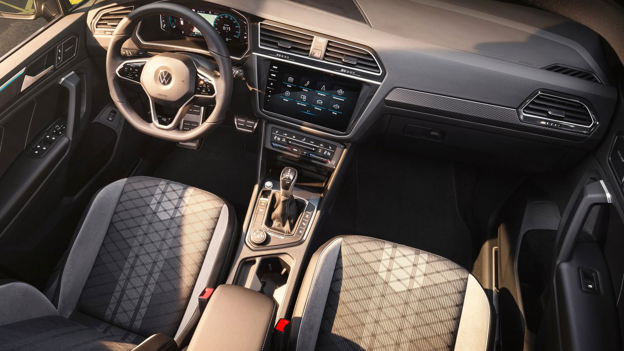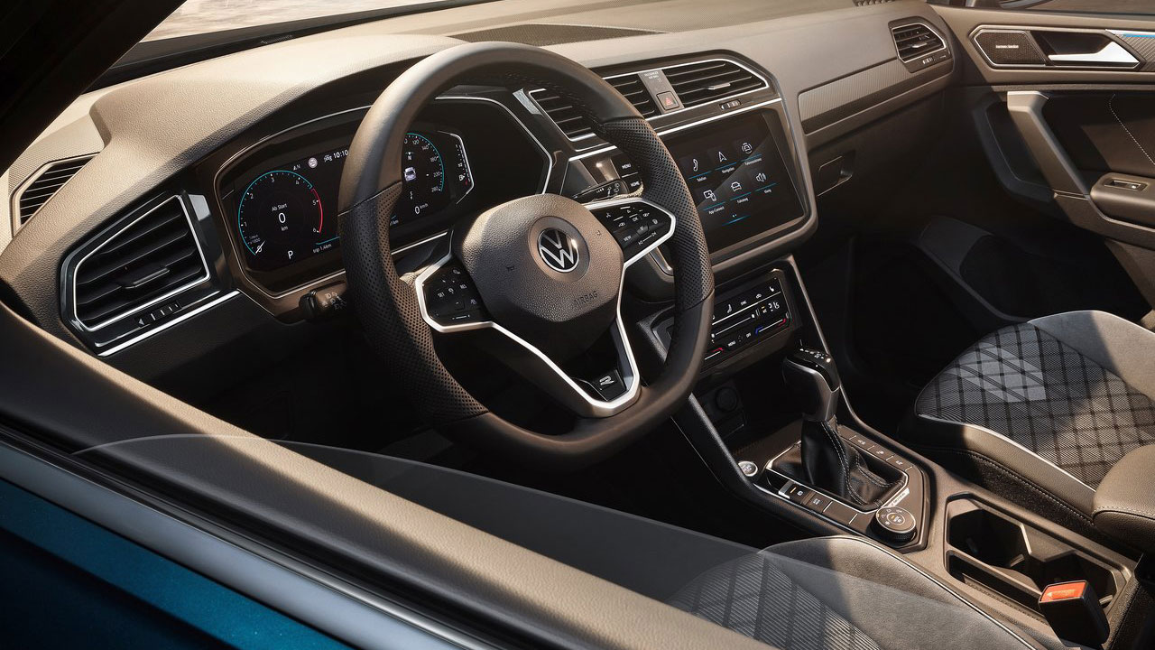 Στο εσωτερικό, το VW Tiguan εξοπλίζεται στην έκδοση R-Line με μία οθόνη σε ρόλο πίνακα οργάνων πίσω από το τιμόνι, ενώ η τυπική οθόνη αφής έχει μέγεθος 8 ιντσών. Η τελευταία εξοπλίζεται εκτός των άλλων με κάμερα οπισθοπορείας, ενώ υπάρχει και ασύρματη συνδεσιμότητα Android Auto και Apple CarPlay. Κορυφαία είναι και η πρακτικότητα, με την πίσω σειρά καθισμάτων να είναι συρόμενη, μεταβάλλοντας τον όγκο του χώρου αποσκευών από τα 520 στα 620 λίτρα (1.655 λτ. με τις πλάτες σε ανάκληση).
