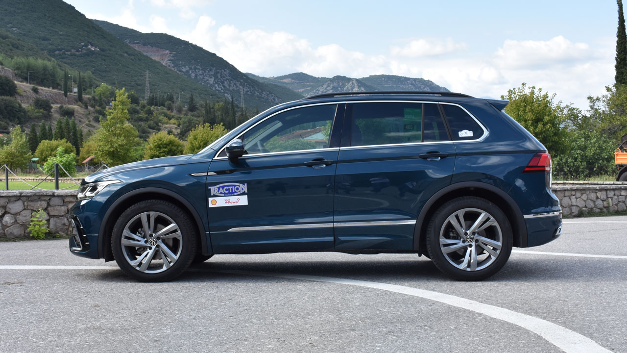 Το VW Tiguan ξεχωρίζει με το μυώδες αμάξωμά του. Έντονα “νεύρα” διατρέχουν το καπό, αλλά και το πλαϊνό τμήμα, στο ύψος των χειρολαβών. Στην εν λόγω έκδοση, μπροστά υπάρχει η σπορ γρίλια με το σχετικό λογότυπο R-Line, ενώ έχει γίνει και εκτεταμένη χρήση νίκελ στη μάσκα και τα άκρα του προφυλακτήρα. Συνεχίζοντας προς το πλάι, συναντάμε τις εντυπωσιακές ζάντες μεγέθους 19 ιντσών με ελαστικά 255/45, ενώ πίσω υπάρχει η αεροτομή σχεδίασης R και η απεικόνιση του ονόματος του μοντέλου ολογράφως. Αναφορικά με τις διαστάσεις, το μήκος του VW Tiguan αγγίζει τα 4.511 χλστ., το πλάτος τα 1.859 και το ύψος τα 1.684 χλστ.