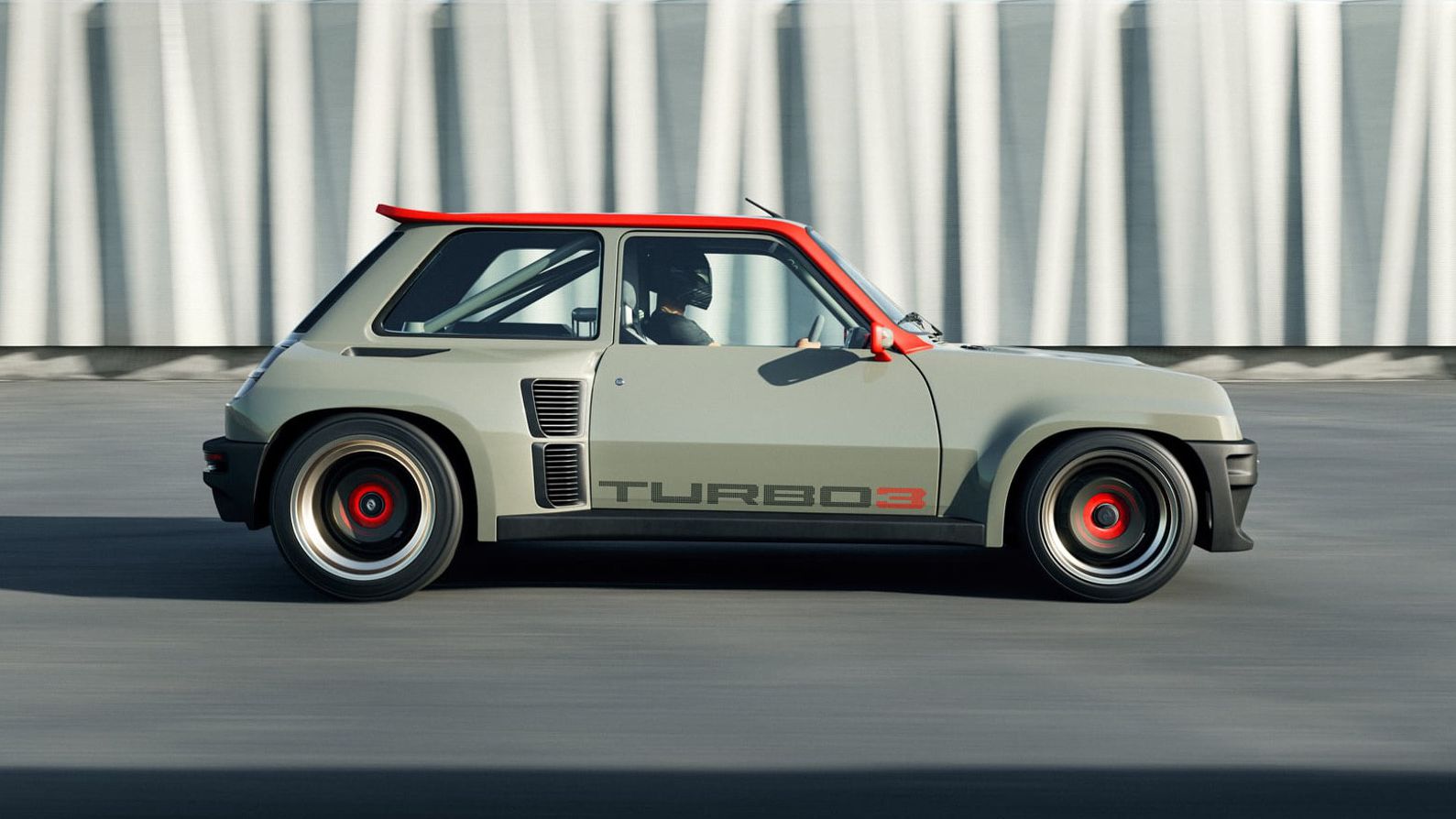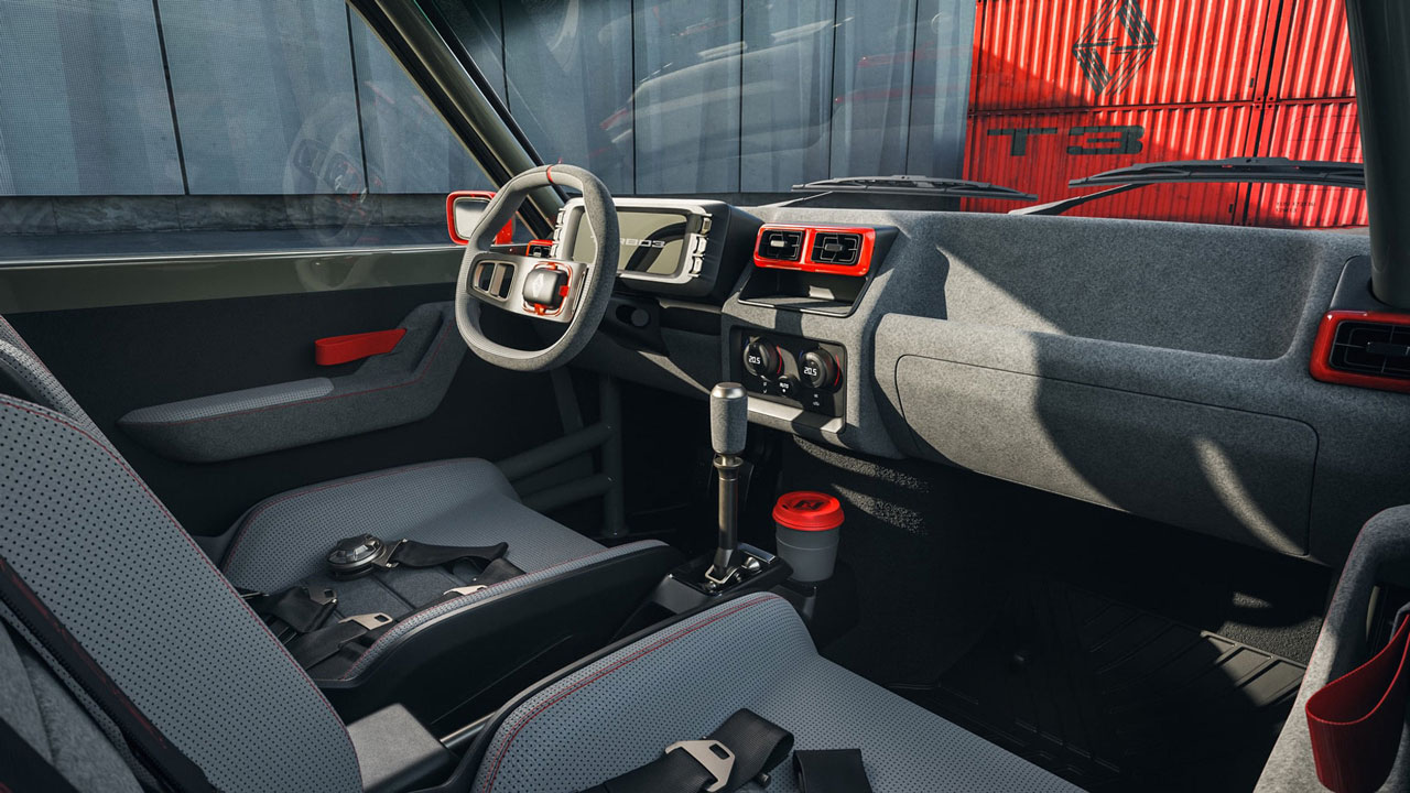 Στο εσωτερικό η κατάσταση είναι τελείως διαφορετική, αφού πίσω από το τιμόνι πλέον συναντάμε μία σύγχρονη, ψηφιακή οθόνη, αντί για τον πίνακα οργάνων. Το τιμόνι είναι απλό σχεδιαστικά και, πέρα από τις δύο ακτίνες, φέρει και την κλασσική “αγωνιστική” λωρίδα. Ασφαλώς, αυτά που “κλέβουν” την παράσταση στην καμπίνα του Renault Turbo 3 είναι τα αγωνιστικά καθίσματα με τις ζώνες τεσσάρων σημείων και το roll cage που δημιουργεί ένα άκρως πολεμικό κλίμα.