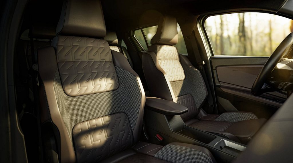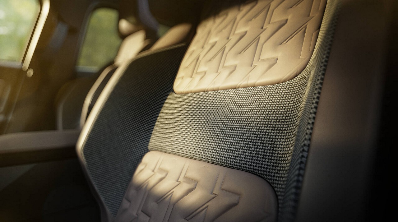 Στο εσωτερικό κυριαρχεί ο λιτός σχεδιασμός, με τις υφασμάτινες (TEP) ταπετσαρίες των καθισμάτων σε απόχρωση Deep Brown. Στο πάνω μέρος της πλάτης των καθισμάτων ένα καπιτονέ μοτίβο με τον αριθμό “4” σε αποχρώσεις διάφορων τόνων, προσθέτει μια διαφορετική αισθητική πινελιά. Το ίδιο σαγρέ μοτίβο ξεχωρίζει στην επένδυση της πλάτης και των πλευρικών τμημάτων.
