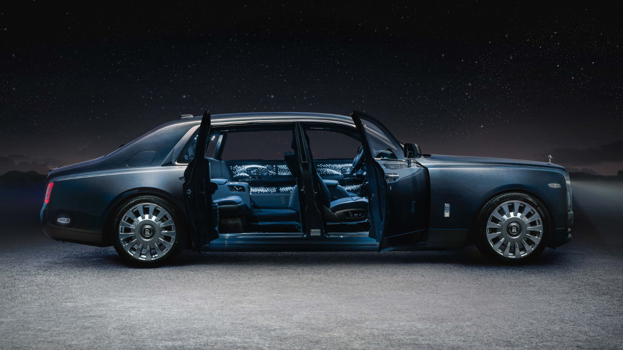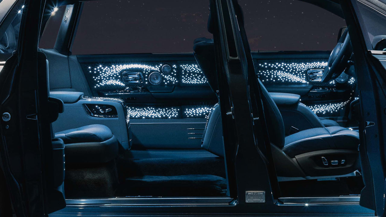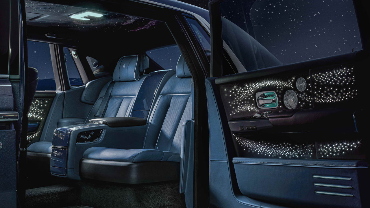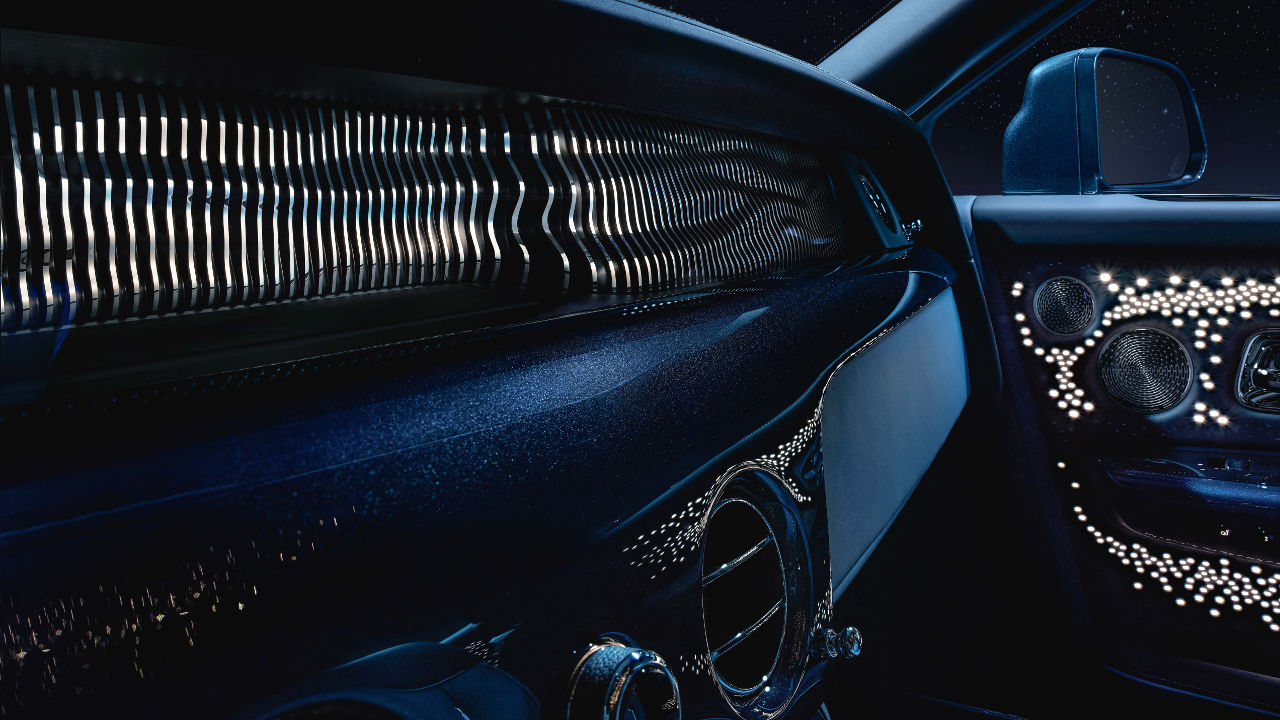 Αξιοποιώντας χιλιάδες οπτικές ίνες που κάνουν την εμφάνιση τους στις πόρτες αλλά και την οροφή το εσωτερικό αυτής της Phantom θυμίζει πραγματικά μια μικρογραφία του έναστρου νυχτερινού ουρανού. Highlights η αναπαράσταση ενός αστέρα νετρονίων πάλσαρ στην οροφή αλλά και η “Frozen Flow of Time Gallery”, όπως ονομάζουν οι Βρετανοί την προσθήκη στο ταμπλό της Phantom που αποτελείται από 100 μαύρες ανωδιωμένες στήλες, κατασκευασμένες από billet αλουμίνιο.