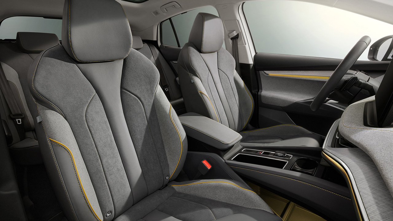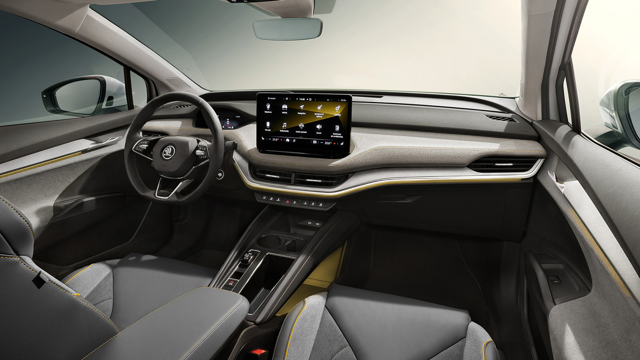 Στο εσωτερικό συναντάμε μία κεντρική οθόνη αφής μεγέθους 13 ιντσών και το ψηφιακό πιλοτήριο φέρει οθόνη 5,3 ιντσών σε ρόλο πίνακα οργάνων. Η SKODA έχει δώσει έμφαση στη χρήση ανακυκλωμένων υλικών, ενώ σημαντική δουλειά έχει γίνει και στον τομέα των χώρων. Το τούνελ μετάδοσης απουσιάζει πλήρως προσφέροντας εξαιρετικούς χώρους για τους πίσω επιβάτες, ενώ ο χώρος αποσκευών αγγίζει την εντυπωσιακή τιμή των 570 λίτρων.