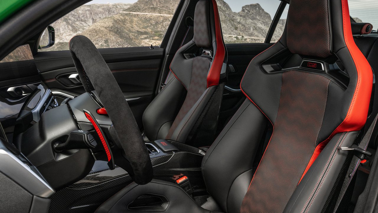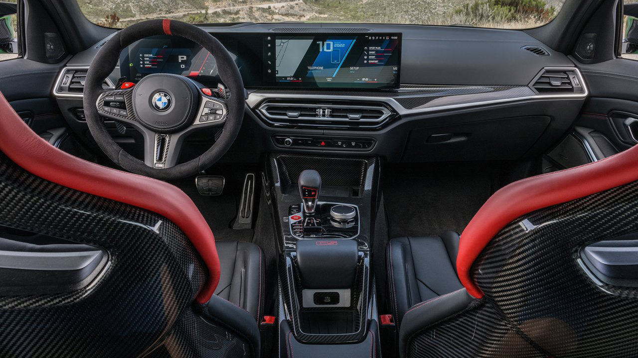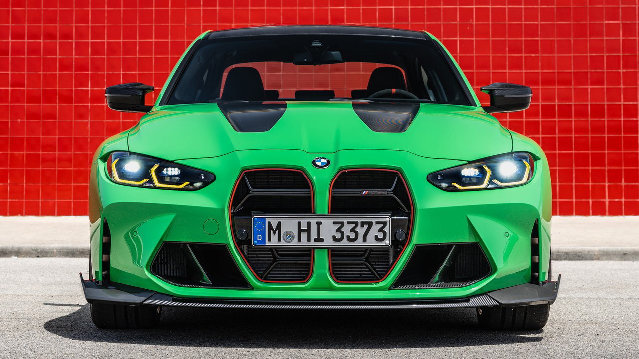 Πάμε και στην εμφάνιση της BMW M3 CS, εκεί όπου υπάρχουν πολλά στοιχεία που θυμίζουν την φιλοσοφία της κορυφαίας BMW M4 CSL, άλλωστε κάποια εξαρτήματα έρχονται απευθείας από αυτήν. Για παράδειγμα, στο εμπρός τμήμα συναντάμε carbon αεροδυναμικά βοηθήματα χαμηλά, ενώ η αμφιλεγόμενη μάσκα “στολίζεται” από ένα κόκκινο πλαίσιο. Η οροφή είναι επίσης carbon, ενώ στο καπό υπάρχουν μαύρες λεπτομέρειες με αποτέλεσμα να δημιουργείται μία διχρωμία.