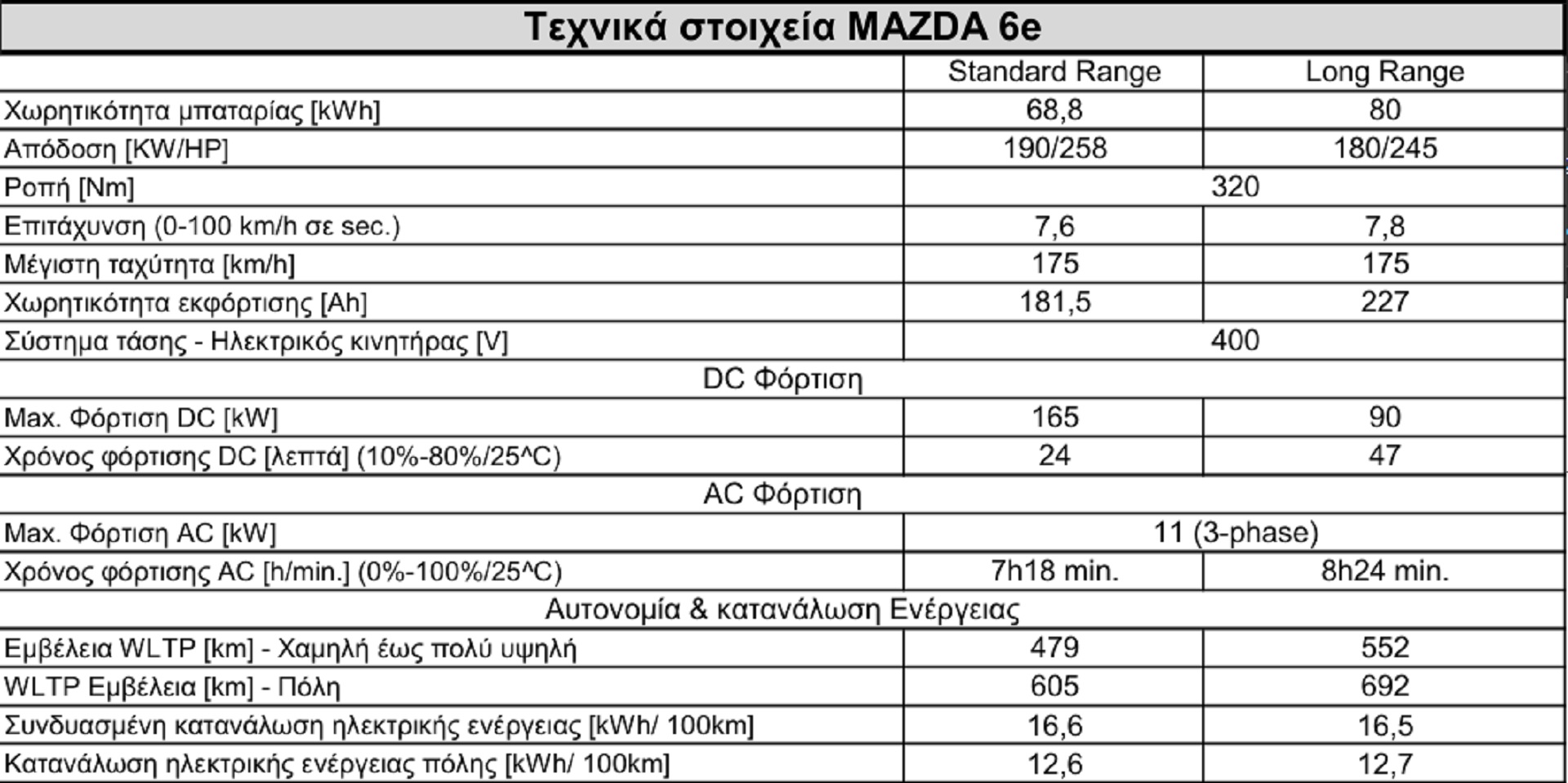 Μία αξιοσημείωτη διαφοροποίηση βλέπουμε και στη μέγιστη ταχύτητα φόρτισης, με την έκδοση Standard Range να επιτρέπει ισχύ φόρτισης έως 165 kW που επιτρέπει πλήρωση της μπαταρίας από 10 έως 80% μέσα σε 24 λεπτά. Από την άλλη, η Long Range έχει μέγιστη ισχύ 90 kW και ο αντίστοιχος χρόνος είναι τα 47 λεπτά. Στον πίνακα που ακολουθεί μπορείτε να δείτε τα σημαντικότερα τεχνικά χαρακτηριστικά, αλλά και την αυτονομία, η οποία στην έκδοση με την μεγάλη μπαταρία μπορεί να ξεπεράσει τα 550 χλμ. σε μεικτές συνθήκες.
