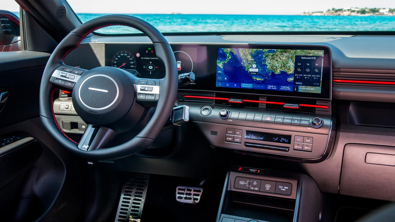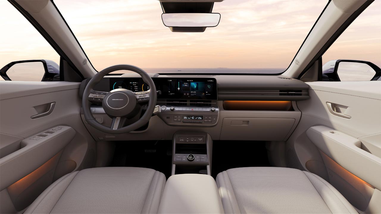 Χάρη στις αναβαθμισμένες διαστάσεις του μοντέλου και την καινοτόμο αρχιτεκτονική που προέρχεται από το ΚΟΝΑ EV, η Hyundai Motor κατάφερε να σχεδιάσει μία μεγαλύτερη καμπίνα. Το οδηγοκεντρικό ταμπλό τονίζεται από ένα οριζόντιο C-Pad με ενσωματωμένες τις διπλές οθόνες 12,3 ιντσών που τονίζουν τον high-tech χαρακτήρα του νέου KONA.