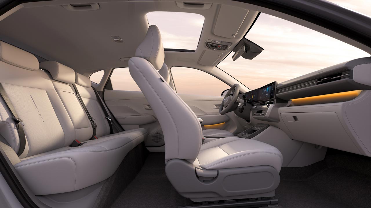 Ως μέρος της νέας διάταξης του νέου ηλεκτροκίνητου KONA, ο επιλογέας ταχυτήτων shift-by-wire έχει μεταφερθεί από την κεντρική κονσόλα στην κολόνα του τιμονιού, γεγονός που επιτρέπει περισσότερο χώρο αποθήκευσης στην κονσόλα. Ο φωτισμός καμπίνας υποστηρίζεται επίσης από ενημερώσεις OTA για συντήρηση και νέες δυνατότητες. Τα μπροστινά καθίσματα παρέχουν βελτιωμένη άνεση στην κατανομή της πίεσης του σώματος βοηθώντας στην ανακούφιση της κόπωσης μετά την οδήγηση. Το Curveless Bench Seat στη πίσω σειρά καθισμάτων μεγιστοποιεί την πρακτικότητα και διαθέτει μοχλό δύο σταδίων για εύκολη ανάκληση.