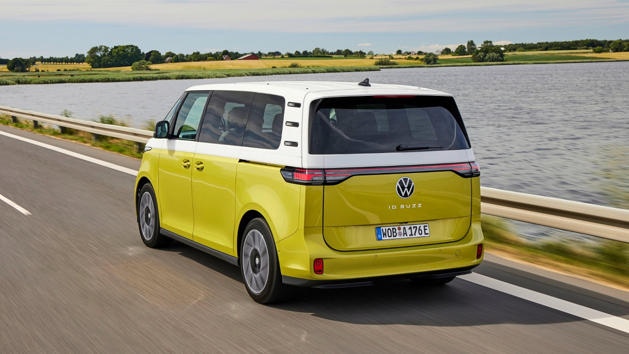 Οι δύο ηλεκτρικές συρόμενες πόρτες του ID. Buzz διατίθενται στάνταρ όπως και η πίσω ηλεκτρική πόρτα. Αυτό που απλώνεται πέρα από τη μεγάλη πίσω πόρτα είναι – με πέντε επιβάτες – 1.121 λίτρα χώρου αποσκευών (φορτωμένο μέχρι το επάνω άκρο της πλάτης της δεύτερης σειράς καθισμάτων). Εάν η δεύτερη σειρά καθισμάτων αναδιπλωθεί, η χωρητικότητα αυξάνεται στα 2.205 λίτρα.