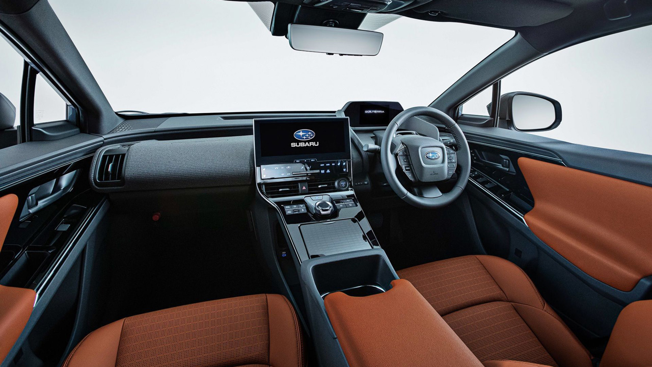 Επιστρέφουμε στο Subaru Solterra και στην εξωτερική του εμφάνιση, η οποία είναι άκρως δυναμική. Έντονα νεύρα διατρέχουν όλο το SUV αμάξωμα διαστάσεων 4.690×1.860×1.650 χλστ., οι πλευρικές προστατευτικές επενδύσεις και οι ράγες οροφής προσδίδουν έναν crossover χαρακτήρα. Επιπλέον, δεν απουσιάζουν τα “sportive” στοιχεία, όπως για παράδειγμα η ιδιαίτερη αεροτομή στο πίσω μέρος και οι εντυπωσιακές ζάντες με μέγεθος από 18 έως 20 ίντσες. H σχεδίαση του εσωτερικού έρχεται αυτούσια από το Toyota bZ4x, εκεί συναντάμε οθόνη σε ρόλο πίνακα οργάνων πίσω από το τιμόνι, αλλά και μία μεγάλη οθόνη αφής στην κεντρική κονσόλα.
