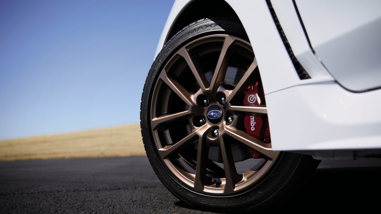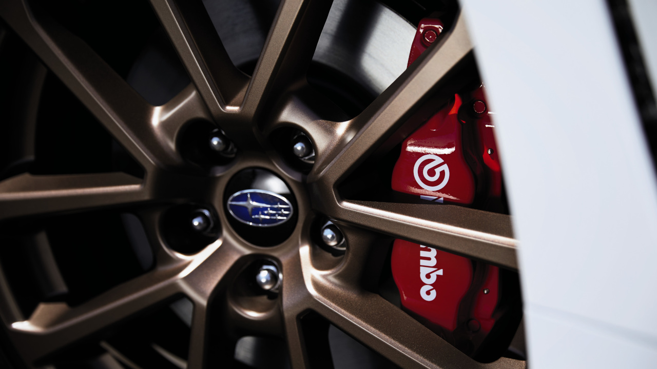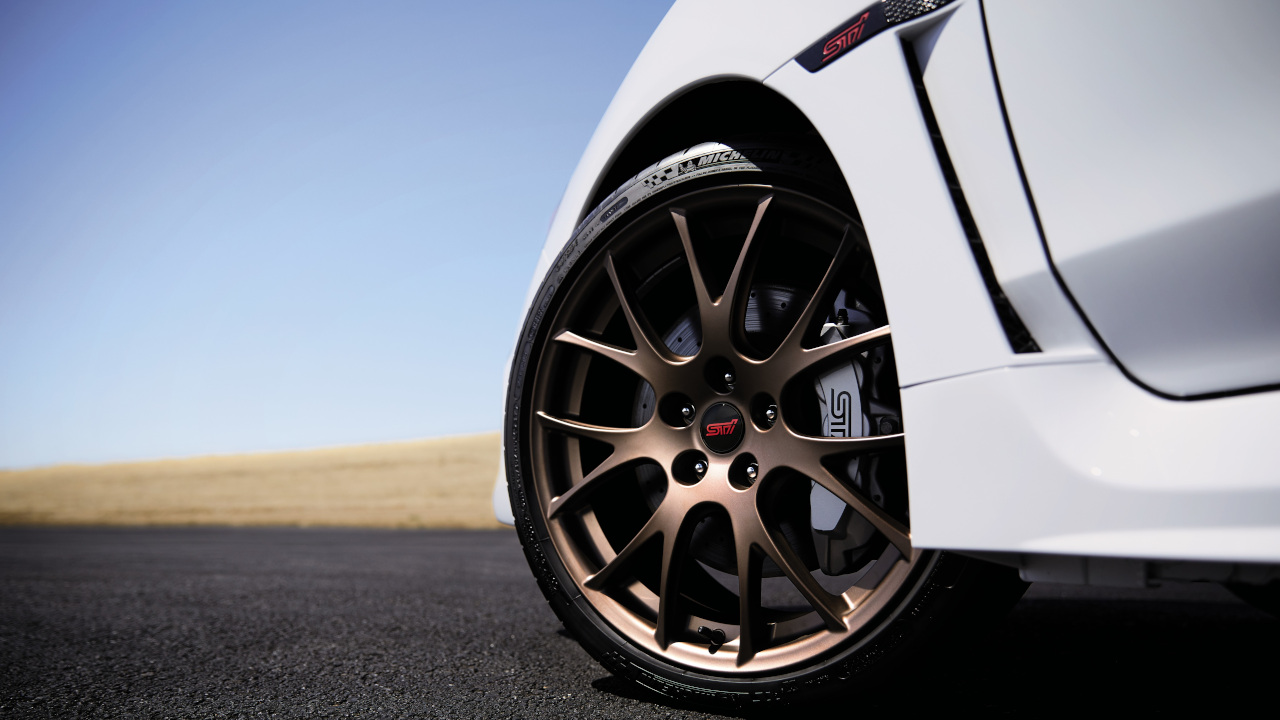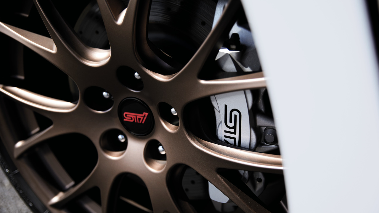 Διαφορετικές είναι και οι βάσεις της κρεμαγιέρας για καλύτερη αίσθηση στο τιμόνι, ενώ σε αυτή την περίπτωση οι δαγκάνες της Brembo είναι 6πίστονες μονομπλόκ εμπρός και δύο εμβόλων πίσω, βαμμένες ασημί και φέρουν και το logo της Subaru Technical International. Για να μειωθεί το βάρος, η ρεζέρβα απουσιάζει και στη θέση της έχει τοποθετηθεί ένα κιτ επισκευής ελαστικών. Οι σφυρήλατες ζάντες προέρχονται από την BBS και είναι 19 ιντσών και τα σήματα είναι βαμμένα σε μαύρο ματ χρώμα.