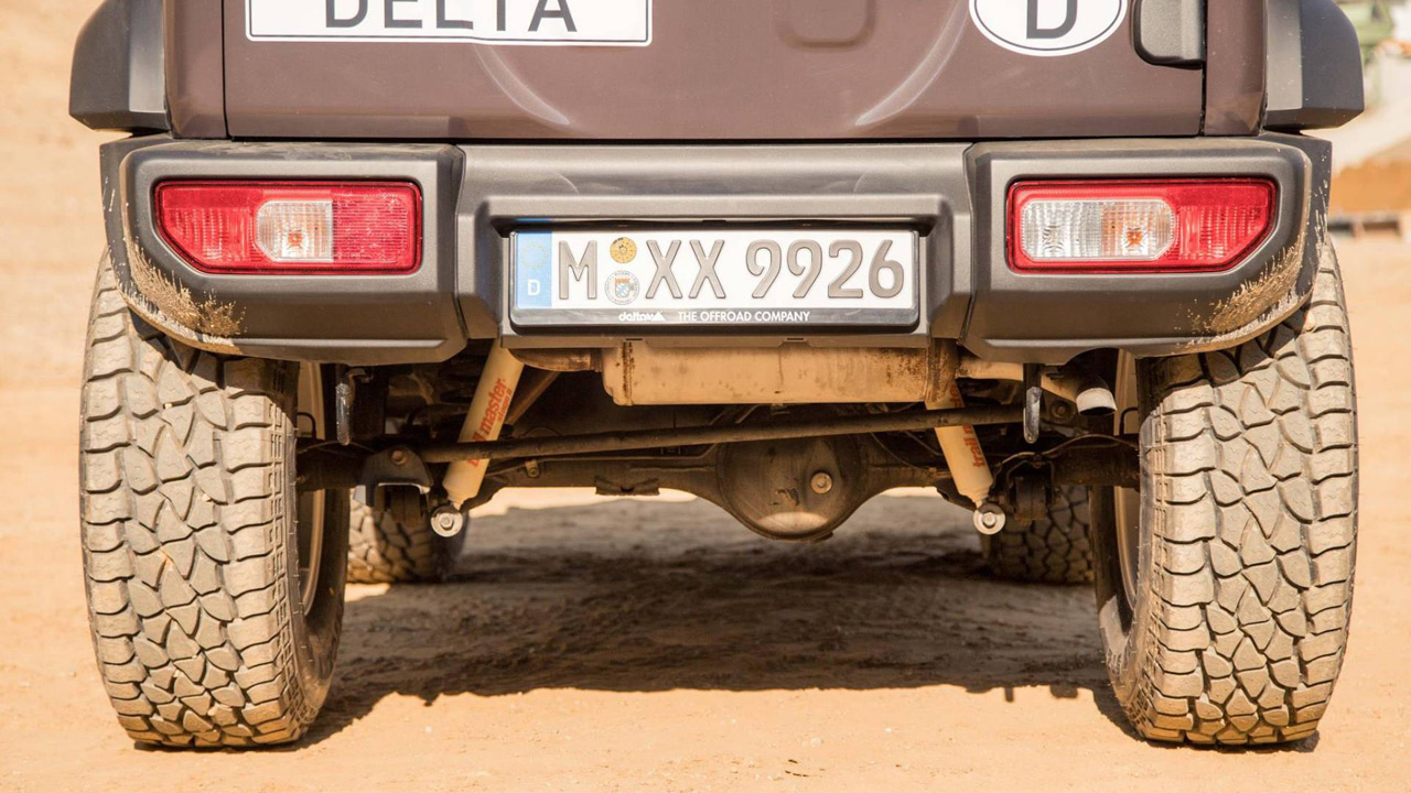 Σε αυτή τη μοντέρνα εκδοχή του, το Suzuki Jimny της Delta 4×4 έχει να επιδείξει αυξημένο απόσταση από το έδαφος κατά 50 χλστ. χάρη στο νέο κιτ ανάρτησης, φαρδύτερα φτερά, νέες ζάντες 16 ιντσών σε λευκό χρώμα και ελαστικά 285/75 R16 Mickey Thompson Baja STZ. Επιπλέον, υπάρχει δυνατότητα τοποθέτησης προβολέα, δίπλα από τον καθρέφτη του οδηγού, bull bar, ράγες οροφής, εργάτης και πολλά ακόμη.