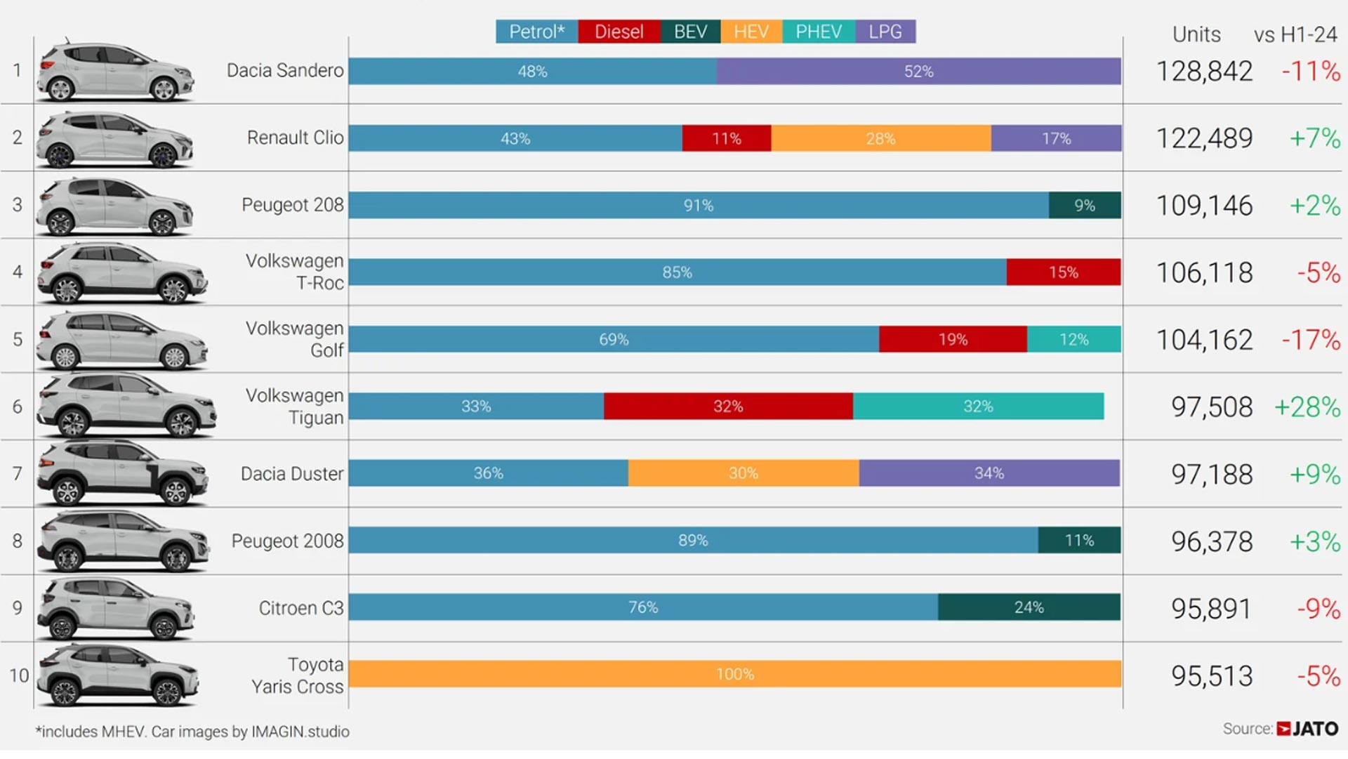 Μπορεί πλέον οι diesel επιλογές να είναι “μετρημένες στα δάχτυλα”, αλλά είναι αξιοσημείωτο το γεγονός ότι από τα δέκα δημοφιλέστερα μοντέλα, τα τέσσερα είναι διαθέσιμα με κινητήρα πετρελαίου. Συγκεκριμένα, είναι αυτά που βλέπετε με κόκκινο χρώμα στην παρακάτω εικόνα. Πρόκειται για τα Renault Clio, VW T-Roc, Golf και Tiguan! Επίσης, ακόμα ένα αξιοσημείωτο στοιχείο είναι ότι στο Top 10 δεν υπάρχει κανένα μοντέλο που να προσφέρεται αποκλειστικά ως αμιγώς ηλεκτρικό.
