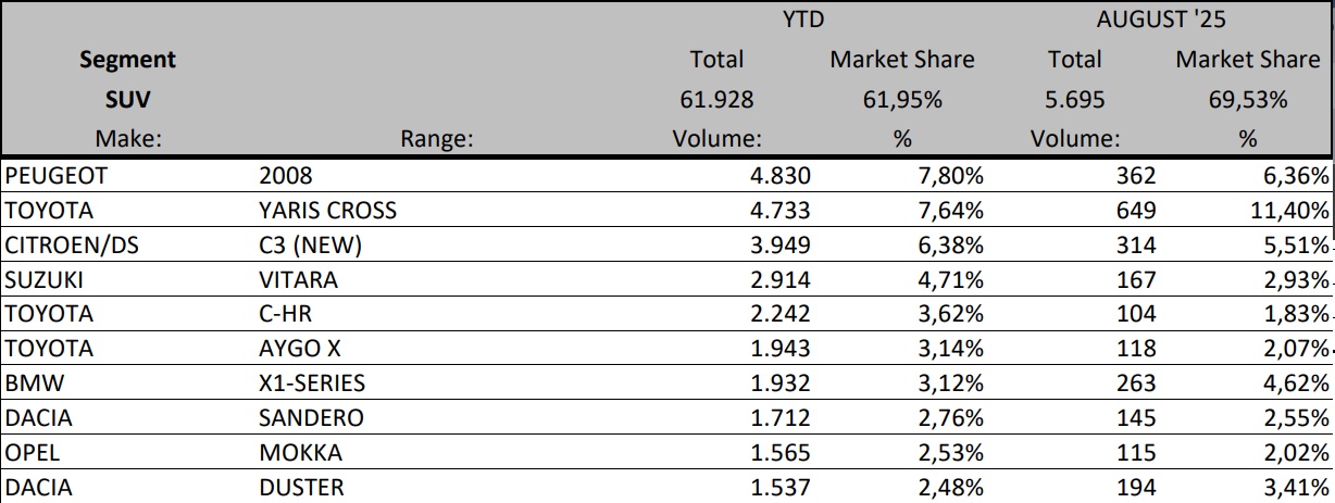 Στο διάστημα από τον Ιανουάριο μέχρι και τον περασμένο Αύγουστο, το Peugeot 2008 βρίσκεται στην πρώτη θέση των SUV (αλλά και συνολικά όλων των αυτοκινήτων ανεξαρτήτου κατηγορίας) έχοντας καταγράψει 4.830 ταξινομήσεις. Στη δεύτερη θέση ακολουθεί το Toyota Yaris Cross, το οποίο έπειτα από έναν εξαιρετικό Αύγουστο έφτασε σε “απόσταση αναπνοής” από το best seller της αγοράς πετυχαίνοντας 4.733 ταξινομήσεις.
