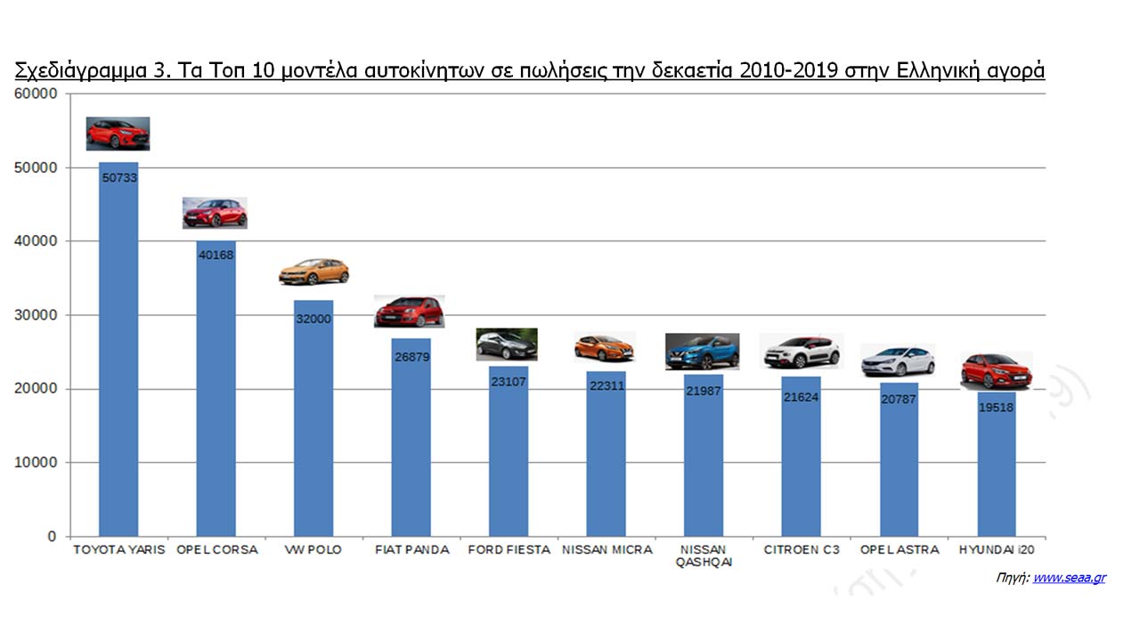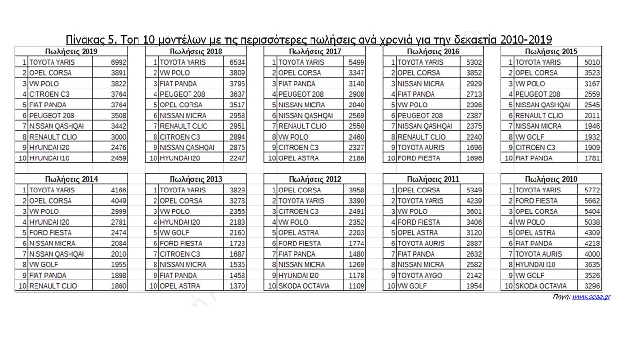 Όσον αφορά τα κορυφαία μοντέλα με τις περισσότερες πωλήσεις την τελευταία 10ετία λοιπόν, το Τoyota Yaris κατέχει την πρωτιά με 50.733 πωλήσεις. Ακολουθεί το Opel Corsa με 40.168 πωλήσεις, ενώ τρίτο σε πωλήσεις είναι το VW Polo με 32.000 πωλήσεις. Τέταρτο είναι το Fiat Panda με 26.879 ταξινομήσεις, ενώ 5ο είναι το Ford Fiesta με 23.107 πωλήσεις. Στην 6η θέση βρίσκεται το Nissan Micra με 22.311 πωλήσεις, στην 7η θέση βρίσκεται το Nissan Qashqai με 21.987 ταξινομήσεις, στην 8η θέση είναι το Citroen C3 με 21.624 πωλήσεις, στην 9η θέση είναι το Opel Astra με 20.787 πωλήσεις, ενώ την δεκάδα κλείνει το μικρομεσαίο μοντέλο της Hyundai το i20 με 19.518 πωλήσεις.