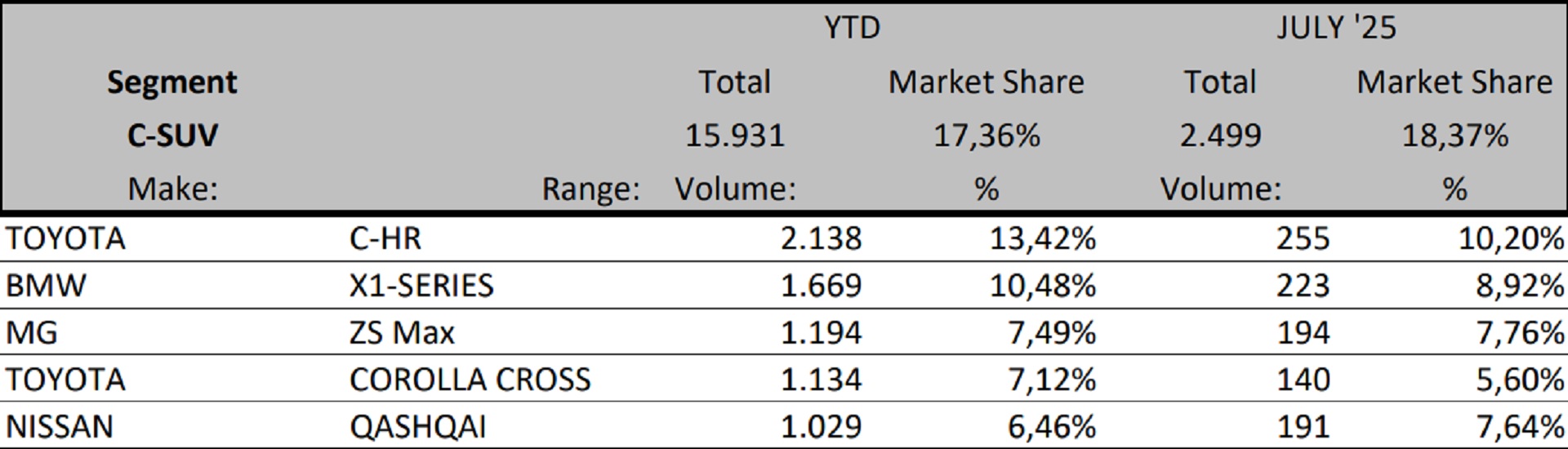 Στην πρώτη θέση συναντάμε το Toyota C-HR, το οποίο καταγράφει στο 7μηνο κατέγραψε 2.138 ταξινομήσεις και η τιμή του στην Ελλάδα ξεκινά από τα 28.300 ευρώ. Το εν λόγω ποσό αφορά στην υβριδική έκδοση με τους 140 ίππους και το στάνταρ αυτόματο eCVT. Στη δεύτερη θέση ακολουθεί η BMW X1. Το βαυαρικό μοντέλο, εξακολουθεί να διαγράφει μία εντυπωσιακή πορεία στην Ελλάδα. Στο 7μηνο του 2025 έχει “μετρήσει” ήδη 1.669 ταξινομήσεις. Η τιμή του, βάσει του πρόσφατα ενημερωμένου τιμοκαταλόγου, ξεκινά από τα 42.750 ευρώ.