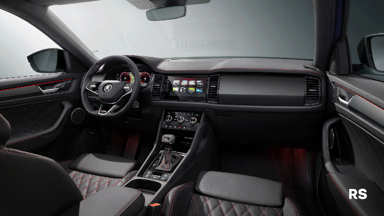 Στο εσωτερικό, το νέο Skoda Kodiaq μπορεί να εξοπλιστεί με ψηφιακό πίνακα οργάνων 10,25 ιντσών που προσφέρει πέντε προσαρμόσιμες και επανασχεδιασμένες διατάξεις. Το προαιρετικό σύστημα ήχου Canton με συνολική απόδοση 625 Watt, έχει επίσης βελτιωθεί. Εκτός από το κεντρικό ηχείο στο ταμπλό και το γούφερ στο πορτμπαγκάζ, το σύστημα έρχεται τώρα με δέκα ηχεία (προηγουμένως, οκτώ). Τα δύο νέα ηχεία βρίσκονται στα πάνελ της μπροστινής πόρτας και πλαισιώνονται από δακτύλιο χρωμίου.