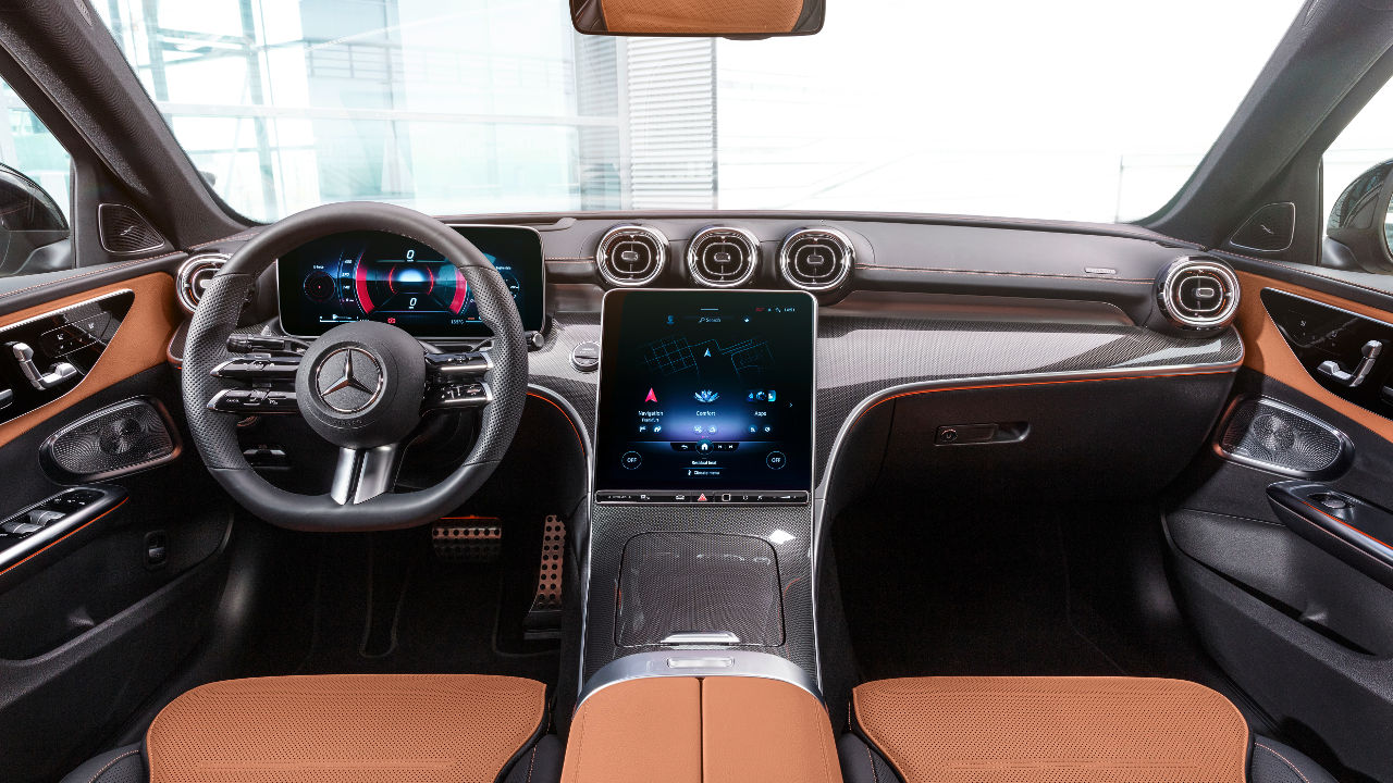 Μια… υπό κλίμακα S-Class βλέπουμε και στην καμπίνα της νέας C-Class με ένα μίνιμαλ σχεδίασης ταμπλό που την κάνει να ξεχωρίζει. Ο οδηγός έχει μπροστά του μια υψηλής ευκρίνειας LCD οθόνη με διαγώνιο στις 10,25 ίντσες, ενώ προαιρετικά μπορεί να την αναβαθμίσει στις 12,3 ίντσες. Highlight βέβαια αποτελεί η επίσης μεγάλη οθόνη για το νέας γενιάς σύστημα πολυμέσων MBUX (επίσης απο την S-Class) σε κάθετη διάταξη, η οποία και καταλαμβάνει το μέγαλύτερο πάνω μέρος της κεντρικής κονσόλας.