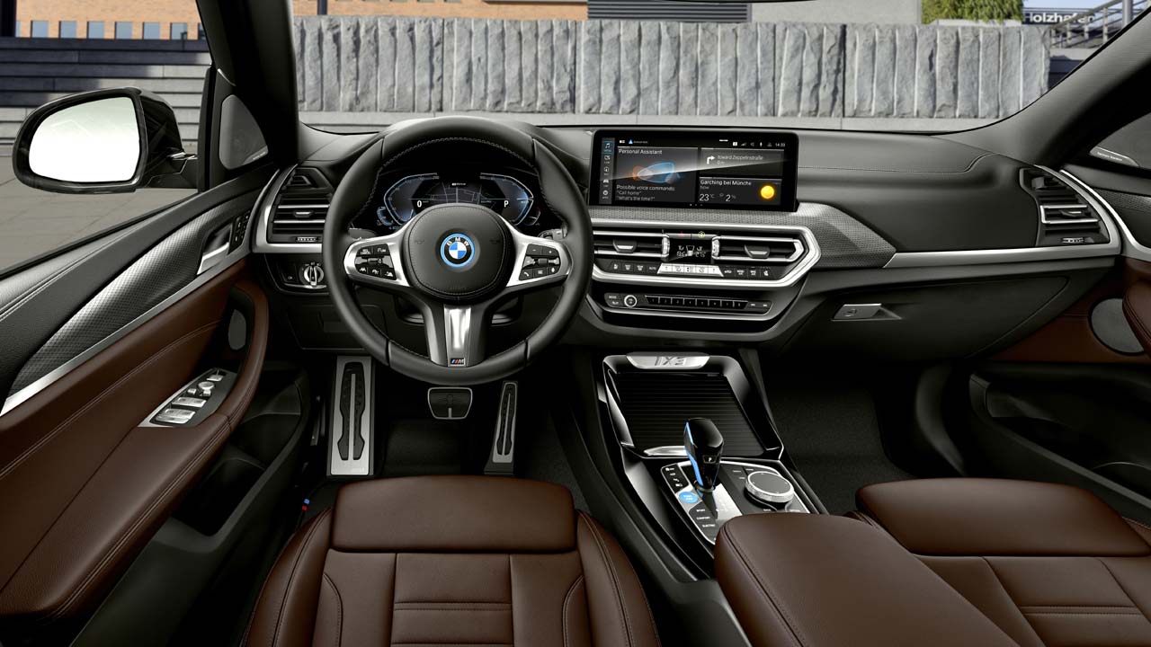 Αλλαγές υπάρχουν και στο εσωτερικό της ανανεωμένης BMW iX3. Τα σπορ καθίσματα είναι πλέον στάνταρ, καθώς και το BMW Live Cockpit Professional με οθόνη 12,3 ιντσών. Οι μπλε λεπτομέρειες είναι και πάλι ορατές γύρω από το κουμπί Start/Stop Engine και το μοχλό ταχυτήτων. Επίσης, υπάρχουν νέα υλικά και συνδυασμοί αυτών.