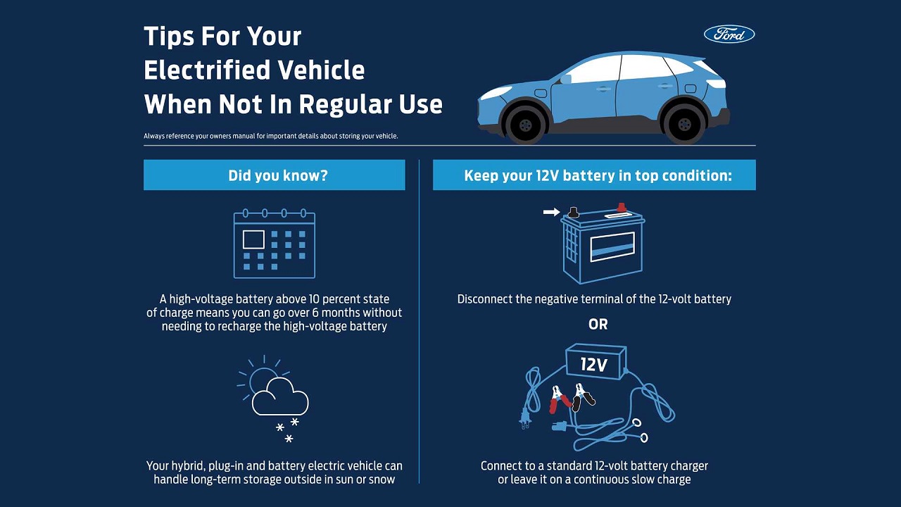 Να ξεκαθαρίσουμε, αρχικά, ότι ένα υβριδικό ή αμιγώς ηλεκτρικό όχημα εξοπλίζεται με μπαταρίες ιόντων λιθίου. Επιπλέον, υπάρχει και η τυπική μπαταρία που συνήθως είναι 12V. Ο τεχνικός μπαταριών της Ford, Bob Taenaka, ξεκαθαρίζει ότι πρέπει να δοθεί ιδιαίτερη προσοχή και στις δύο μπαταρίες όταν δεν υπάρχει συχνή χρήση του οχήματος.