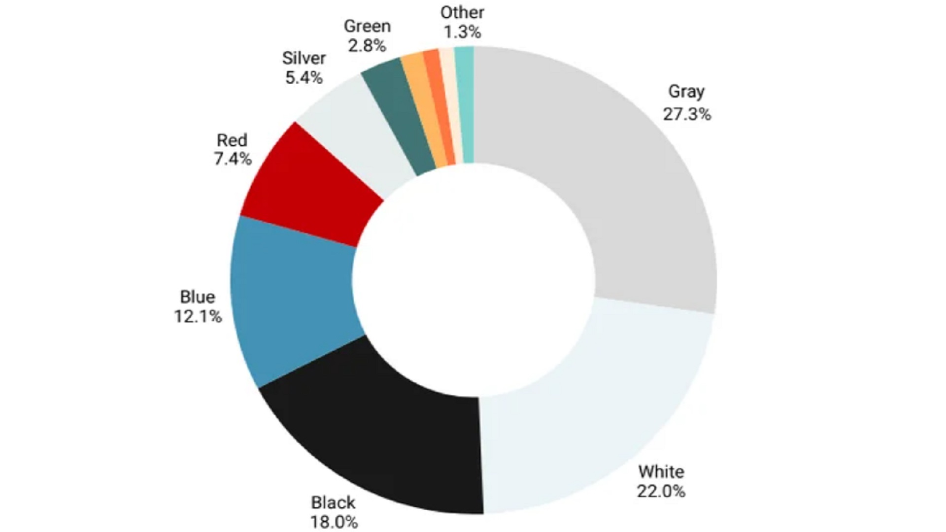 Εντυπωσιακό είναι το γεγονός ότι σχεδόν το 70% των αγοραστών επιλέγουν ένα εκ των γκρι, λευκό και μαύρο, ενώ τα υπόλοιπα χρώματα μοιράζονται μόλις το υπόλοιπο 30%. Ενδιαφέρον έχει επίσης και η ποιότητα του χρώματος που επιλέγεται από τους αγοραστές, με τις μεταλλικές βαφές να “πρωταγωνιστούν” στην αγορά με ποσοστό 64,6%.